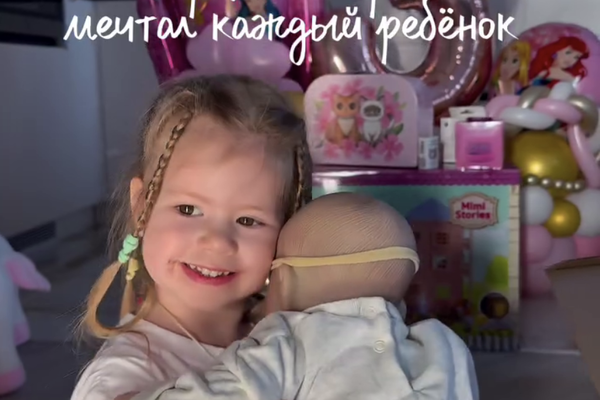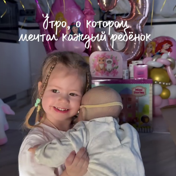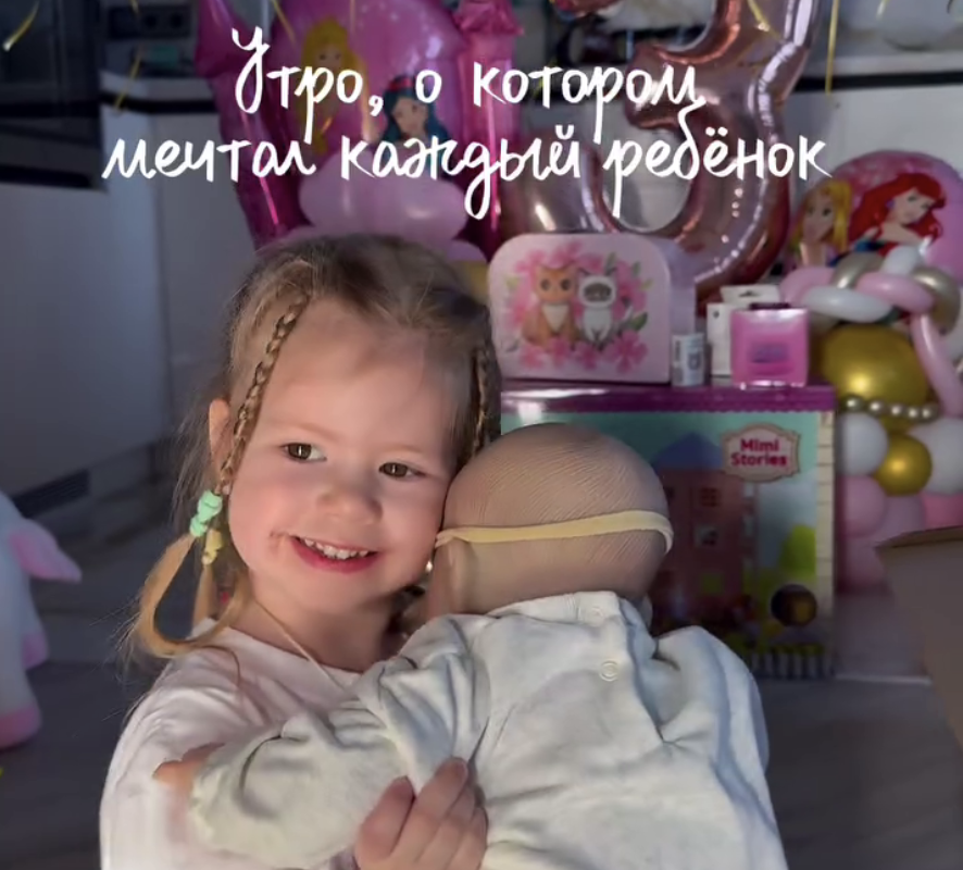 Мария Ильюхина засняла дочь во время празднования ее дня рождения. 3-летняя Мария сидела с подаренной ей куклой на фоне праздничных шаров. Девочка была запечатлена в белую футболку с принтом и розовые пижамные брюки.