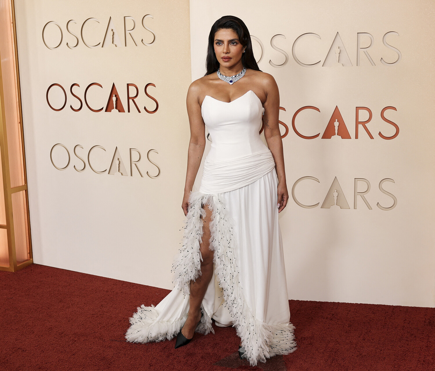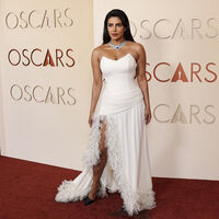 17 февраля Приянка Чопра и ее муж Ник Джонас появились на премьере фильма «Блеф», которая состоялась в Голливуде. Актриса выбрала для закрытого мероприятия коричневое платье с кожаным корсетом и юбкой с разрезом до бедра и шлейфом. Артистка добавила к образу босоножки на каблуках, кольца и ожерелье. Ей уложили волосы в локоны и сделали макияж с розовыми румянами и помадой. Ник Джонас предпочел брючный костюм с рубашкой, шерстяной пиджак и черные туфли.