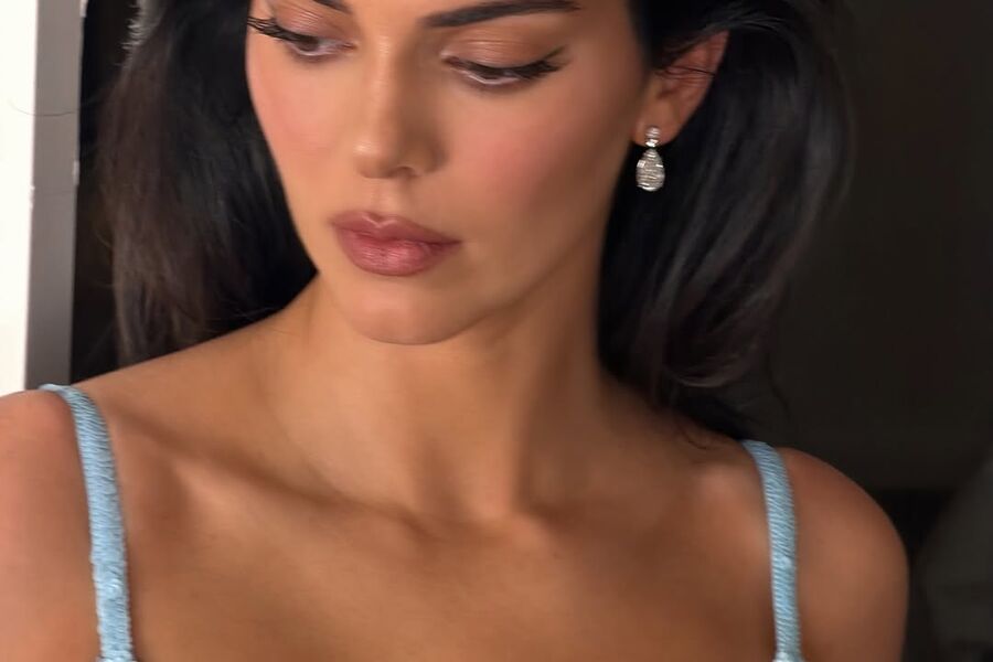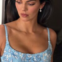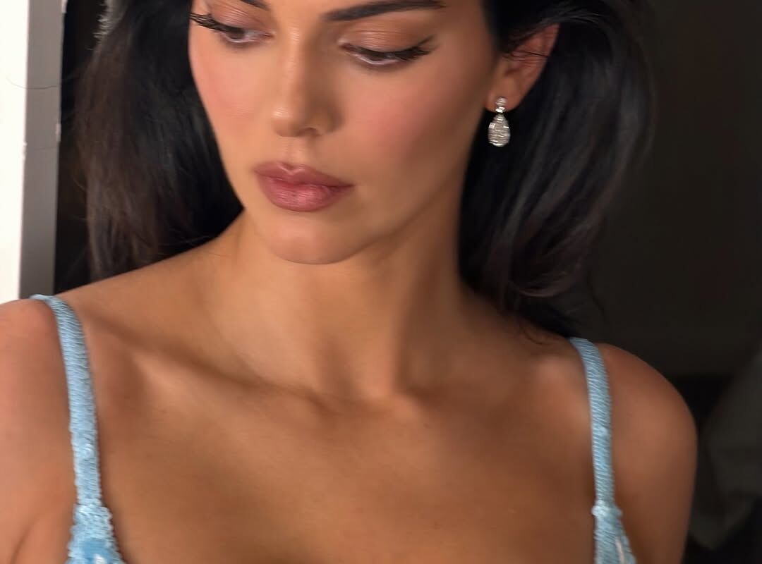 Кендалл Дженнер позировала в голубом корсетном платье со стразами. Образ дополнили серьги с бриллиантами. Волосы модели распустили и сделали вечерний макияж с розовой помадой.