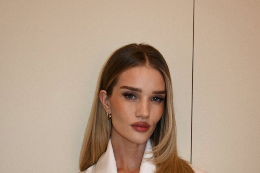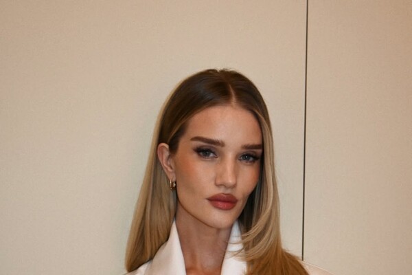 Рози Хантингтон-Уайтли позировала в белом жакете с поясом и черных джинсах. Образ дополнили украшения из золота. При этом модель продемонстрировала новую стрижку каскад и сделала макияж с розовой помадой.