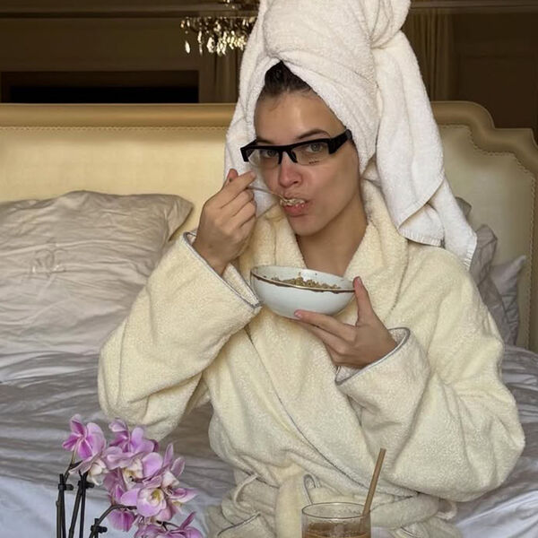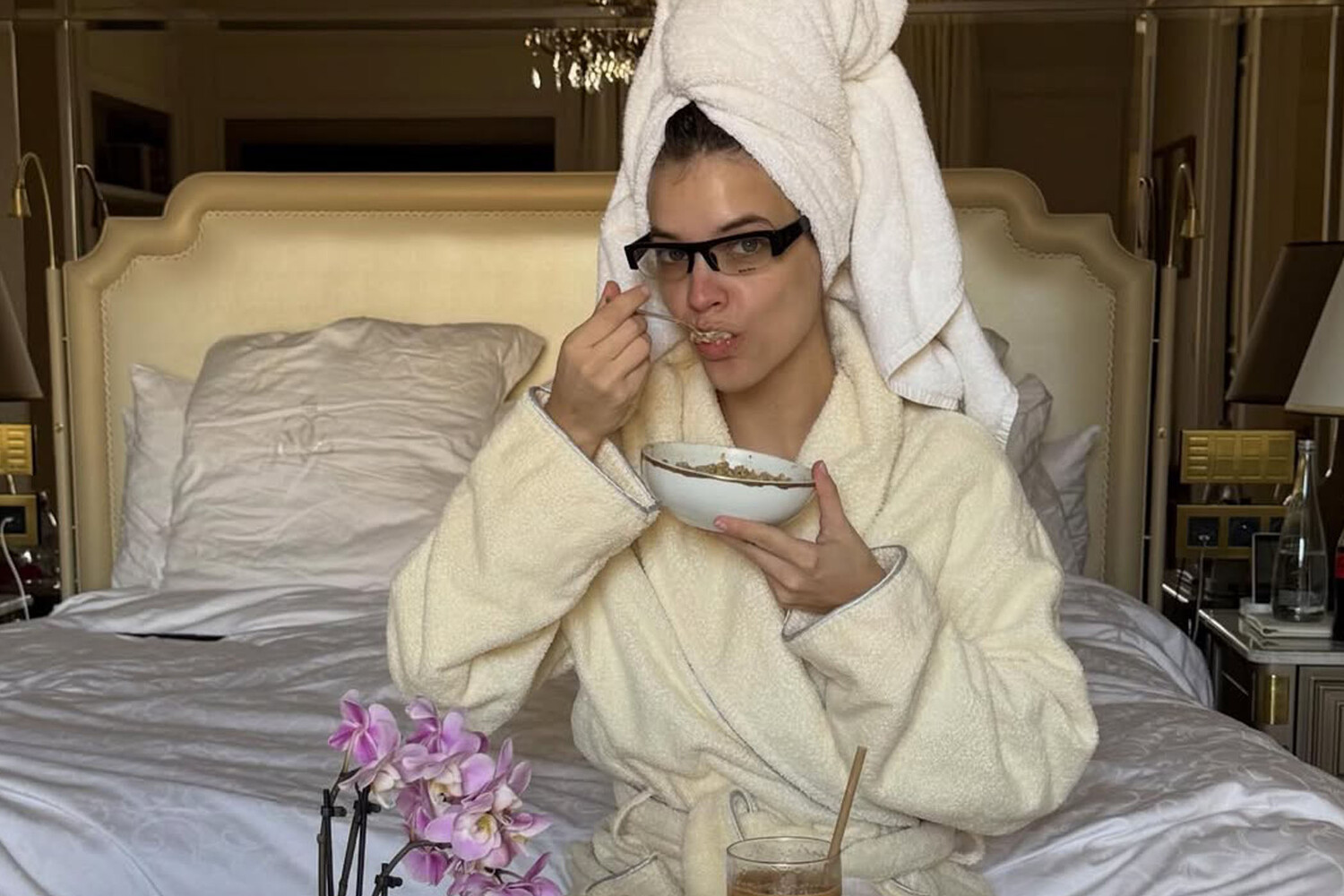 32-летняя Барбара Палвин позировала в желтом халате и черных очках для зрения. Модель предстала перед камерой с убранными под полотенце волосами и без косметики. Манекенщица сидела на кровати с тарелкой каши в руках.
