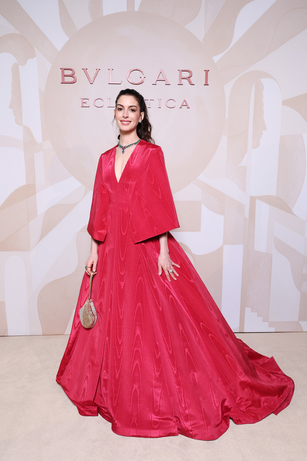 Энн Хэтэуэй посетила показ новой коллекции высокого ювелирного искусства Bvlgari, который состоялся в Милане. Для закрытого светского мероприятия актриса выбрала красное макси-платье с пышной юбкой и глубоким декольте. Артистка добавила к наряду массивное колье с изумрудами, серьги, кольцо и золотой блестящий клатч. Знаменитости собрали волосы в высокий хвост с прядями у лица и сделали вечерний макияж.