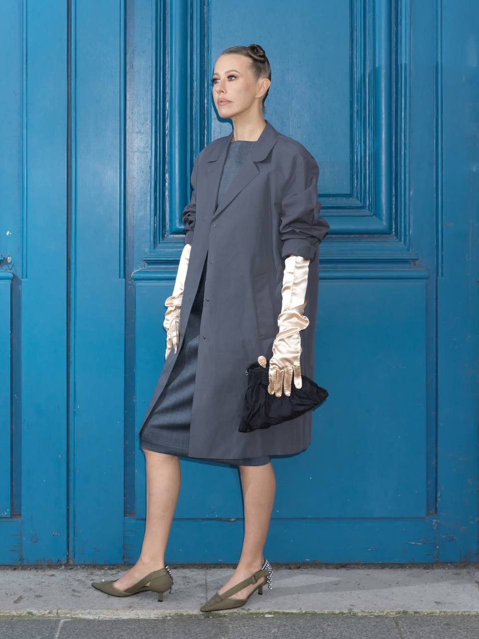 Ксения Собчак позировала в облегающем сером платье без рукавов, высоких золотых перчатках и с черным клатчем-мешком. Волосы ей уложили в низкий пучок и сделали легкий макияж.