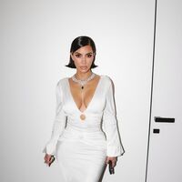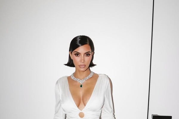 45-летняя Ким Кардашьян предстала перед камерой в белом облегающем макси-платье с глубоким декольте, под которое не стала надевать бюстгальтер. Модель дополнила наряд колье с изумрудами и бриллиантами и кольцами. Звезда реалити-шоу позировала с уложенными распущенными волосами и макияжем с накладными ресницами, коричневыми тенями и нюдовой помадой.