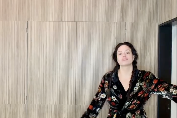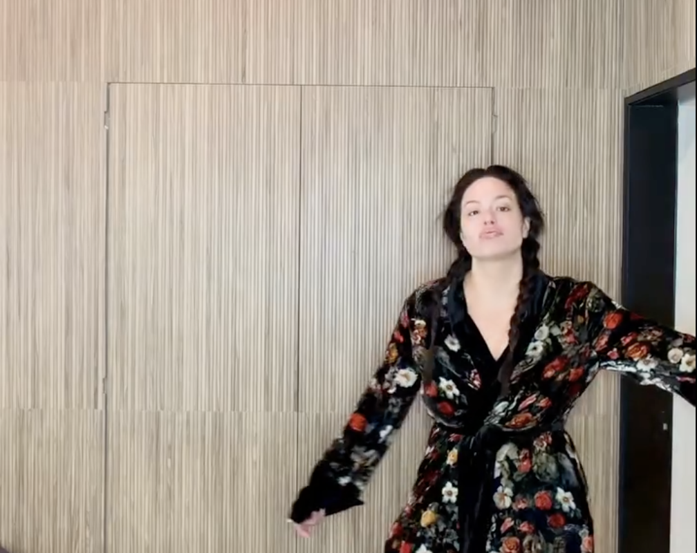 Эшли Грэм была одета в черный халат с цветочным принтом. При этом модель позировала без макияжа и укладки. Перед камерой она показала утреннюю рутину и как делает нюдовый макияж перед зеркалом.
