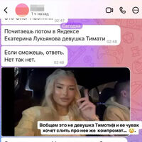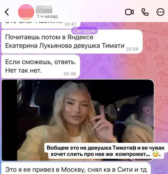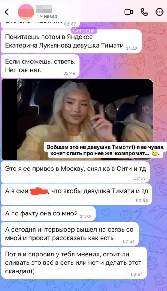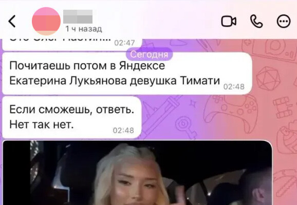 Ирен Феррари выложила переписку с мужчиной по имени Олег, который утверждал, что он встречается с моделью Екатериной Лукьяновой. По словам незнакомца, он обеспечивает манекенщицу, которую подозревают в тайном романе с Тимати. Мужчина в диалоге утверждает, что он «привез в Москву» модель и снял ей квартиру в Москва-Сити. Предполагаемый возлюбленный Лукьяновой также заявил, что хотел бы опровергнуть слухи и рассказать правду о своих отношениях с девушкой, однако сомневается, стоит ли это выносить на публику.