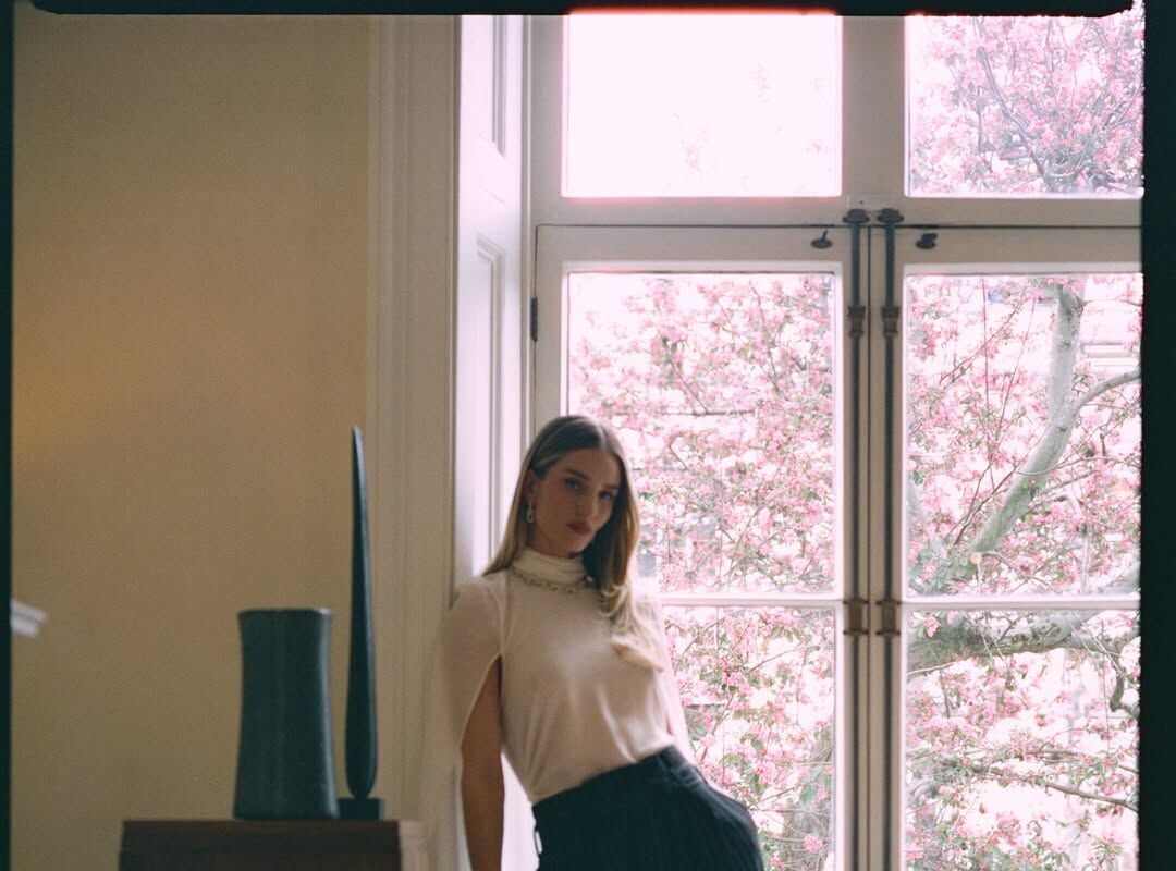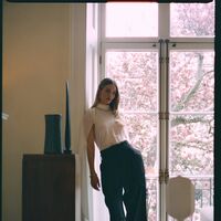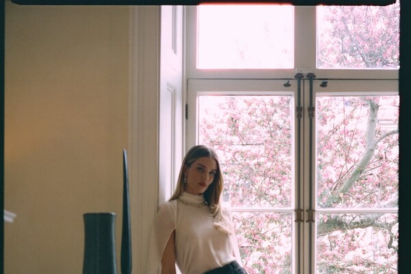 Рози Хантингтон-Уайтли позировала в белой блузе с голыми плечами, черных брюках-палаццо и туфлях с острым мысом. Образ дополнили серьги, цепочка и браслеты с бриллиантами. Волосы ей уложили мягкими прядями и сделали макияж с розовой помадой. Съемка прошла в загородном доме в Лондоне.