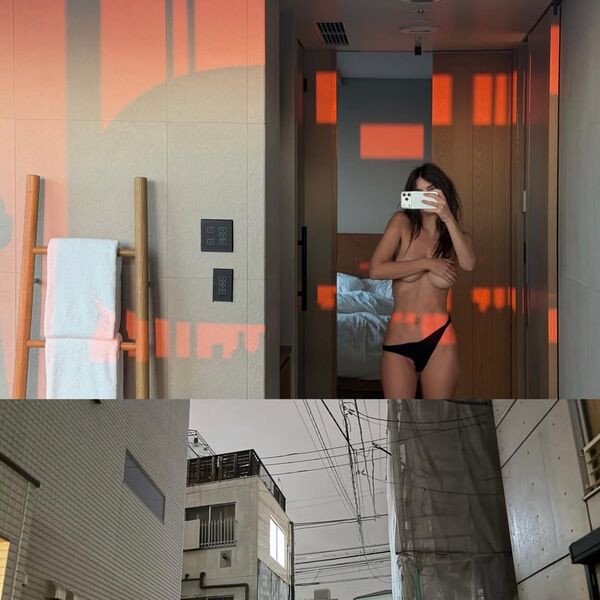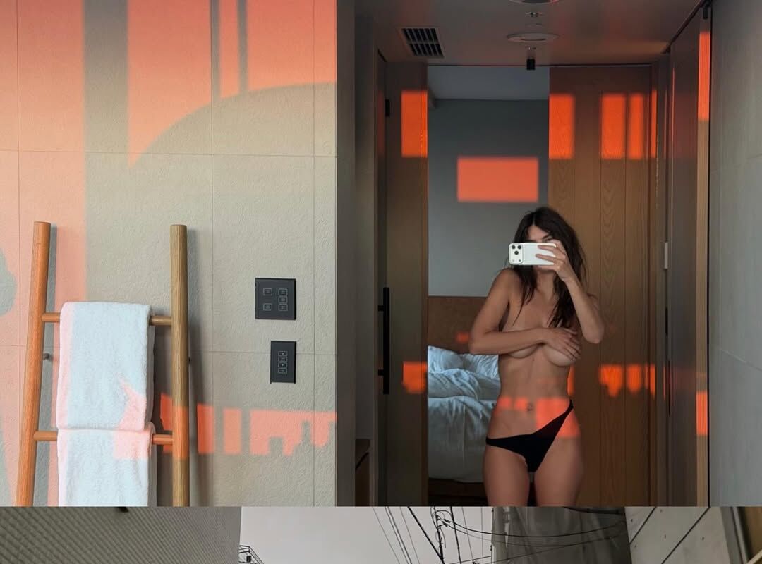 34-летняя Эмили Ратаковски показала кадры, сделанные во время ее пребывания в Токио, Япония. На одном из фото модель стояла перед зеркалом, прикрыв грудь рукой. Манекенщица предстала в черных трусах и с распущенными волосами.