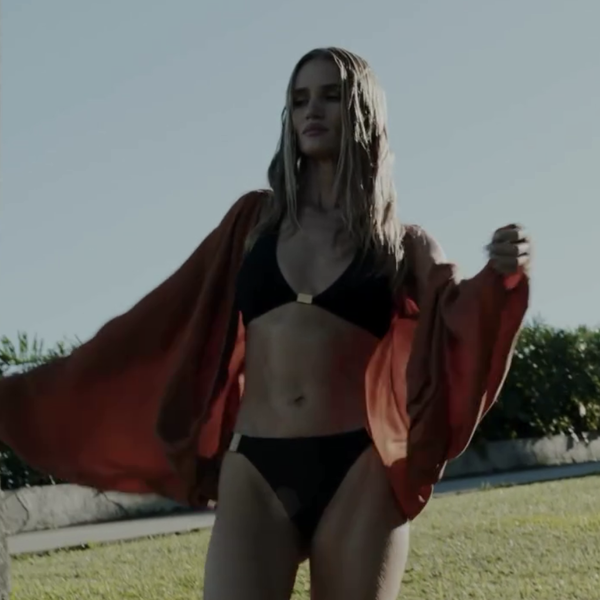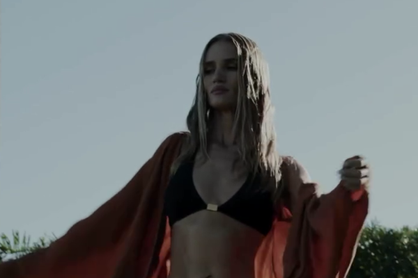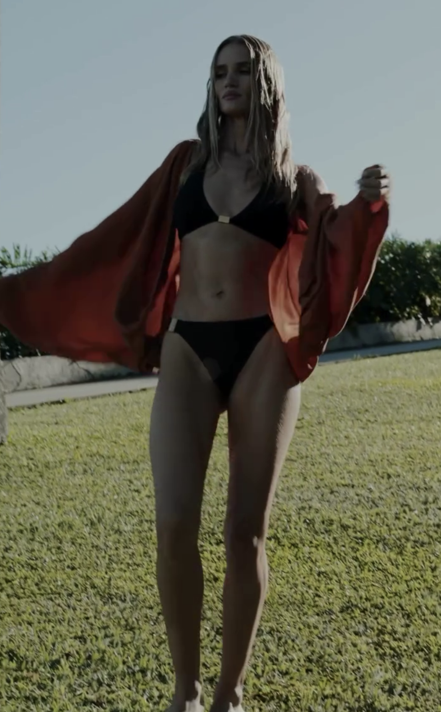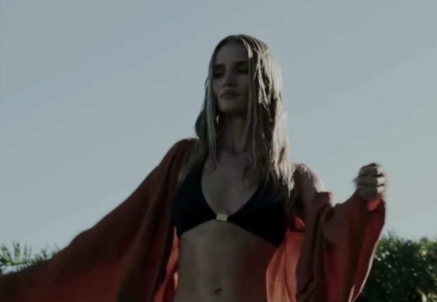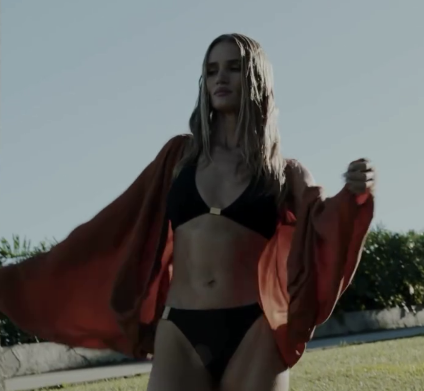 Рози Хантингтон-Уайтли примерила несколько образов с купальниками для рекламы бренда. Модель позировала в белоснежном бикини с золотой цепью, топе с глубоким декольте, а также красном комплекте с халатом в тон. Волосы ей уложили мягкими локонами и сделали легкий макияж.