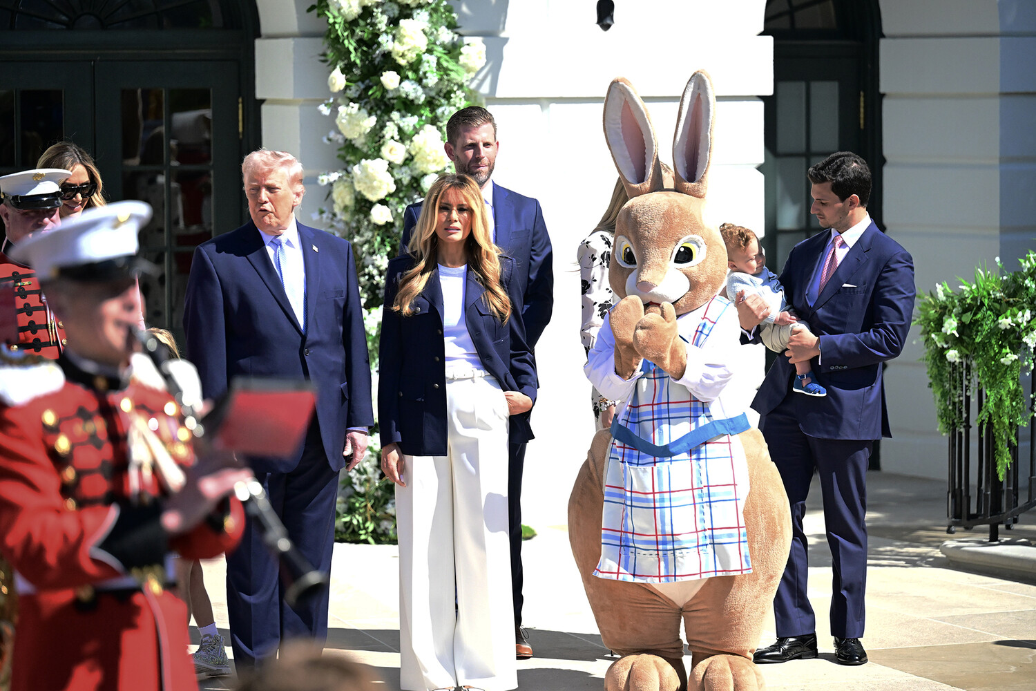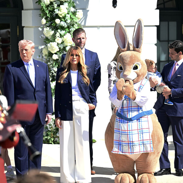 Первая леди США появилась на торжественном мероприятии в белой облегающей футболке, широких брюках в тон и темно-синем жакете. Мелания Трамп вышла на публику с уложенными распущенными волосами и макияжем в естественном стиле. Президент США предпочел темно-синий костюм, белую рубашку и голубой галстук. На одном из кадров супруги позировали рядом с гигантским кроликом.