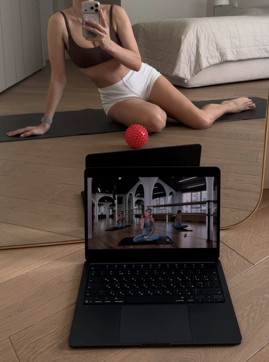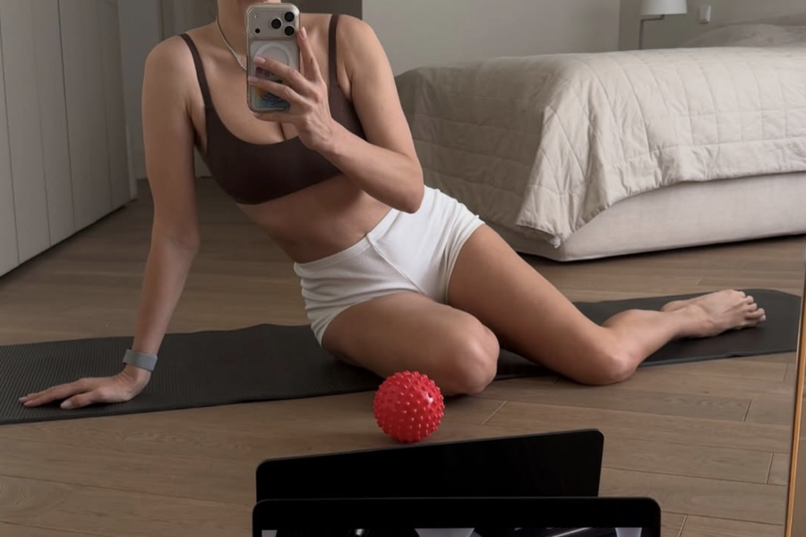 44-летняя Вера Брежнева снялась во время тренировки. Певица позировала перед зеркалом в шоколадном топе и белых коротких шортах. Знаменитость сидела на коврике в спальне.