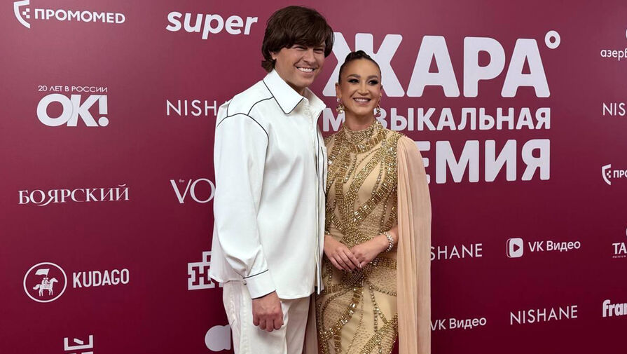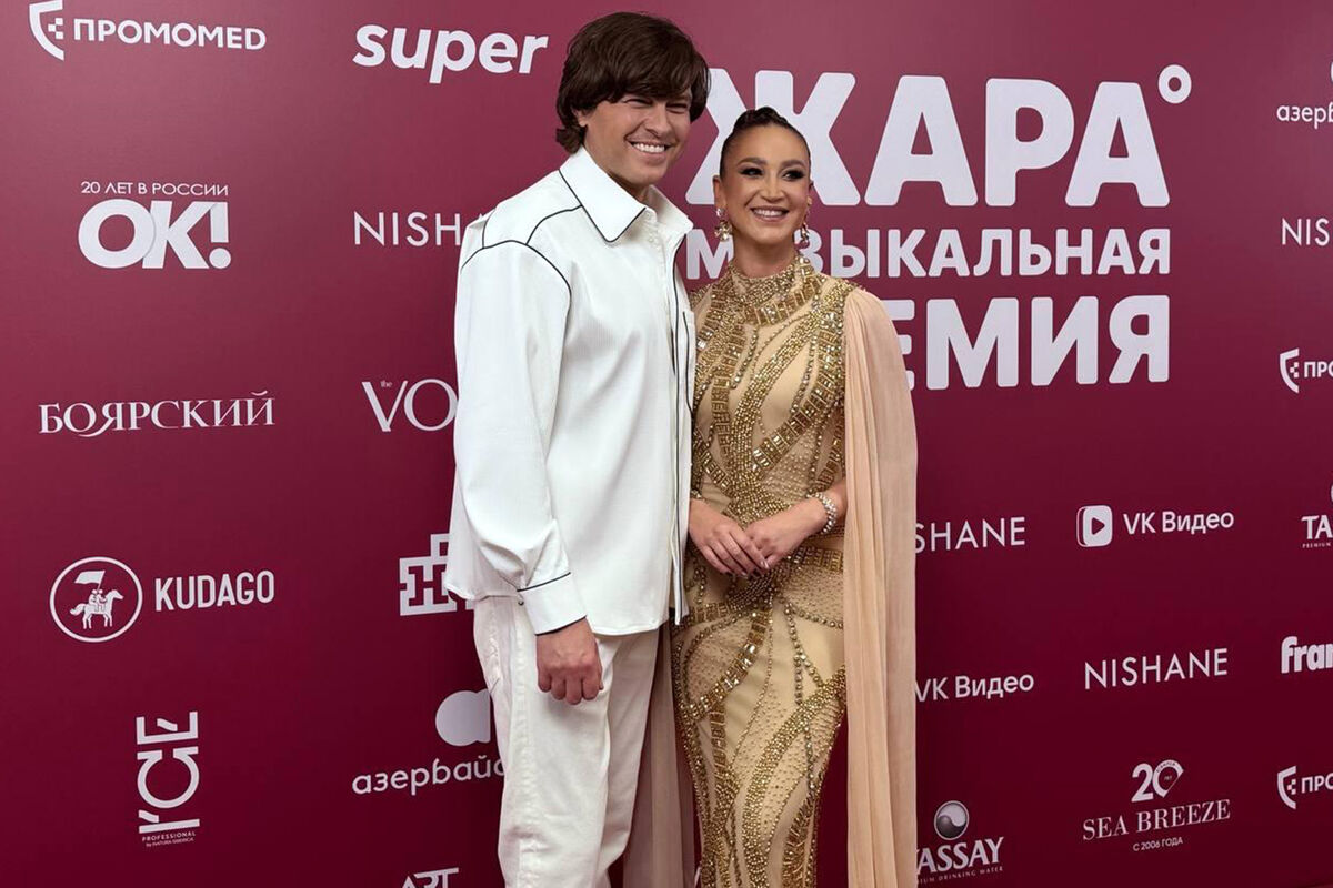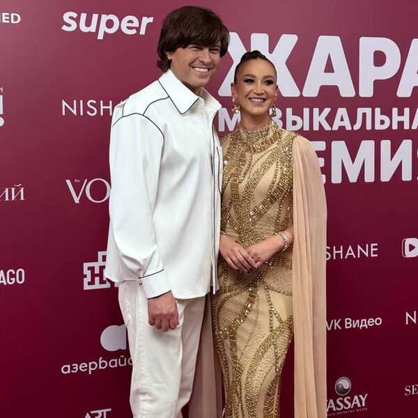Ольга Бузова предпочла для выхода золотое облегающее платье со шлейфом. Образ дополнили длинные серьги. Волосы Бузовой собрали в высокий пучок и сделали вечерний макияж с угольно-черными стрелками. Вместе с ней позировал Прохор Шаляпин в белом костюме.
