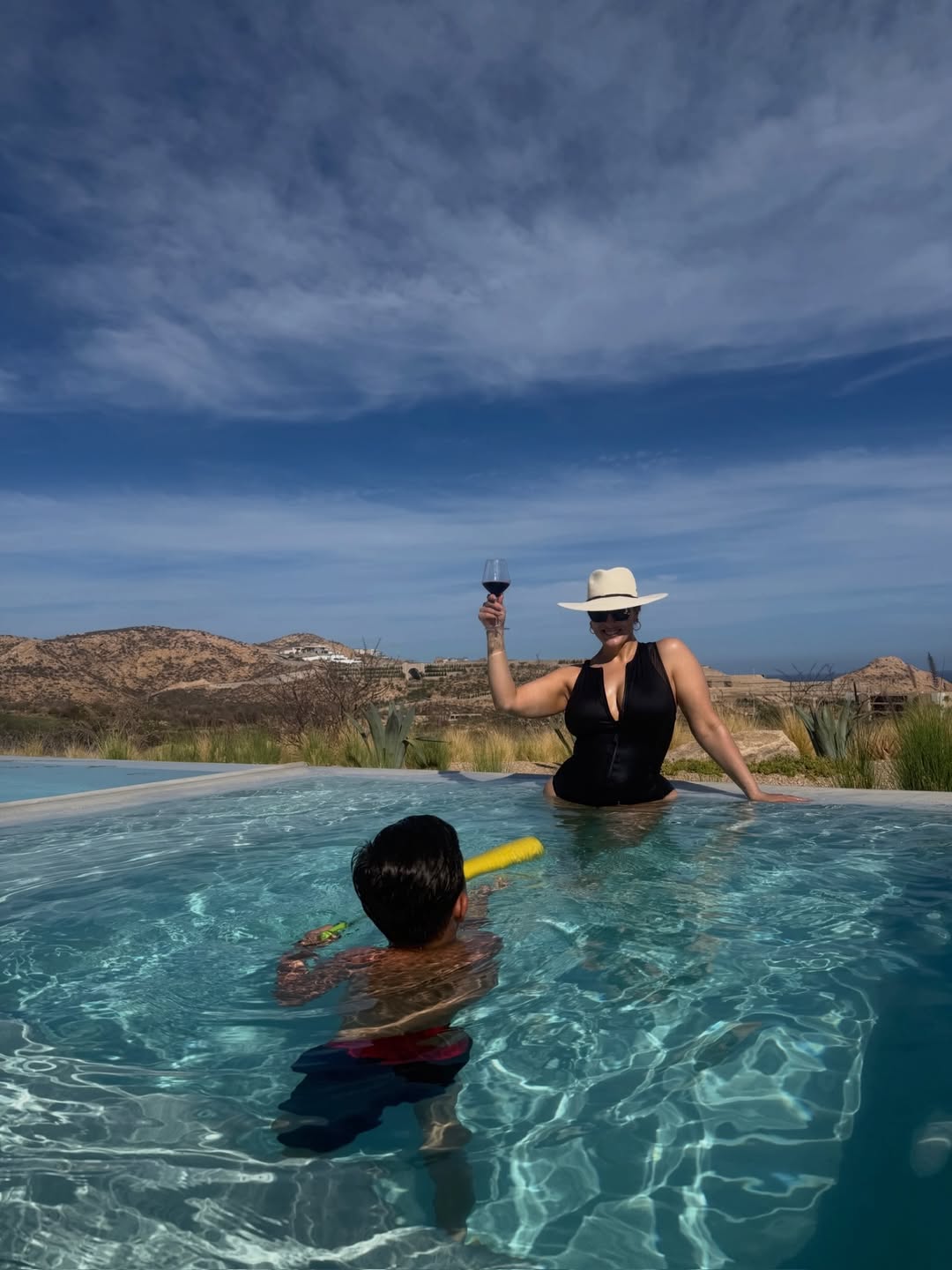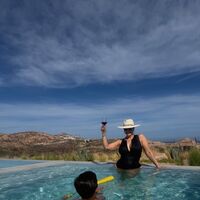 Модель Эшли Грэм позировала в черном слитном купальнике с глубоким декольте. Образ дополнила шляпа. При этом модель позировала без макияжа и укладки. Она стояла в бассейне вместе с сыном.