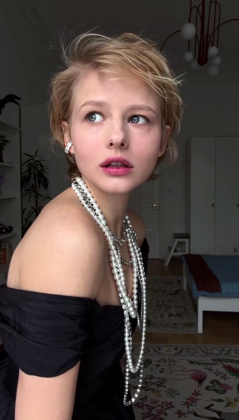 31-летняя Саша Бортич предстала перед камерой с короткой объемной стрижкой и макияжем в естественном стиле с розовым бальзамом для губ. Актриса позировала в черном платье с открытыми плечами, бусах, массивных браслетах и каффе.