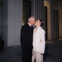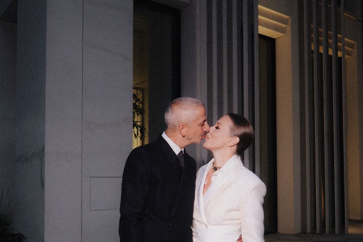 Ксения Собчак позировала перед камерой в белом костюме с широкими брюками, черными сандалиями и золотым чокером. Журналистке уложили волосы в гладкий пучок и сделали макияж. Константин Богомолов был запечатлен в белой рубашке с галстуком и черном брючном костюме и туфлях. На одном из фото супруги целовались.