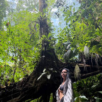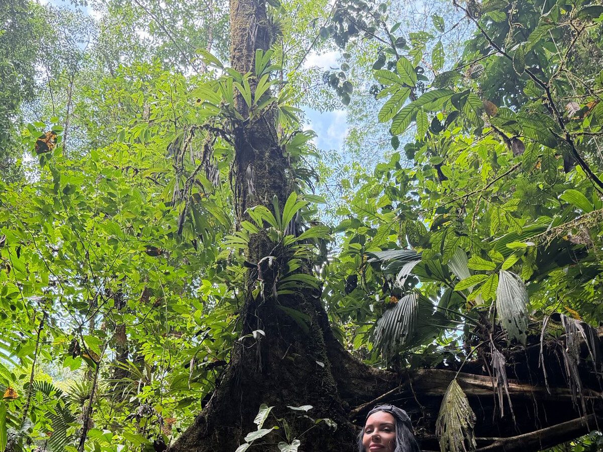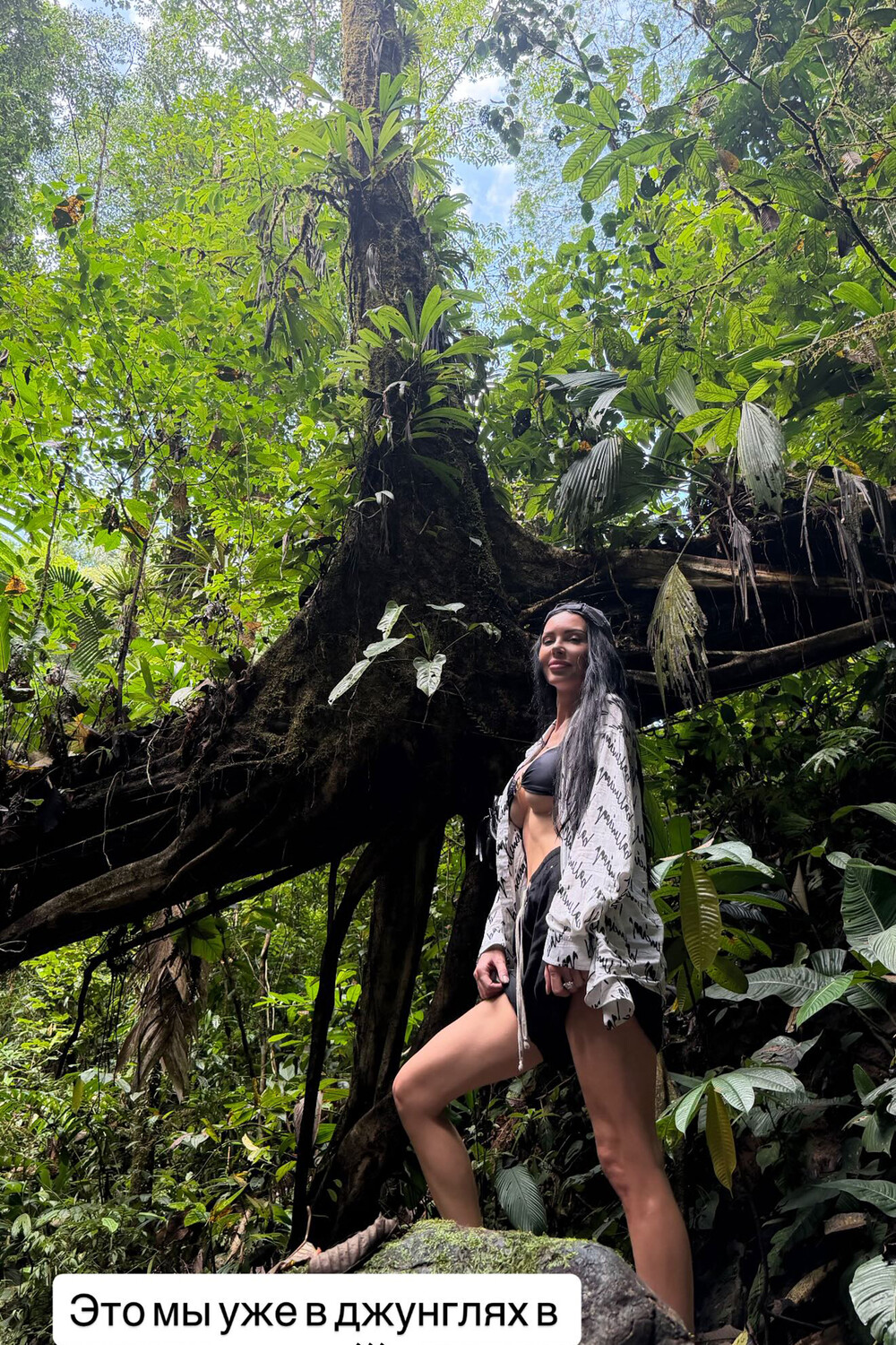 37-летняя Оксана Самойлова была запечатлена во время поездки в джунгли. Блогерша позировала перед камерой в черном ультракоротком топе, шортах и белой накидке с принтом. Знаменитость также надела кепку. Модель снялась с распущенными волосами и без макияжа на фоне деревьев.