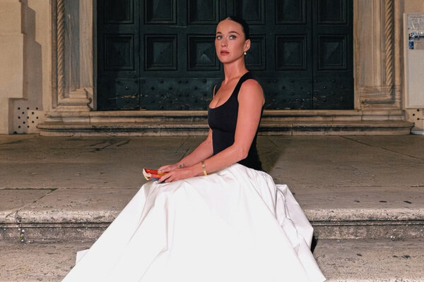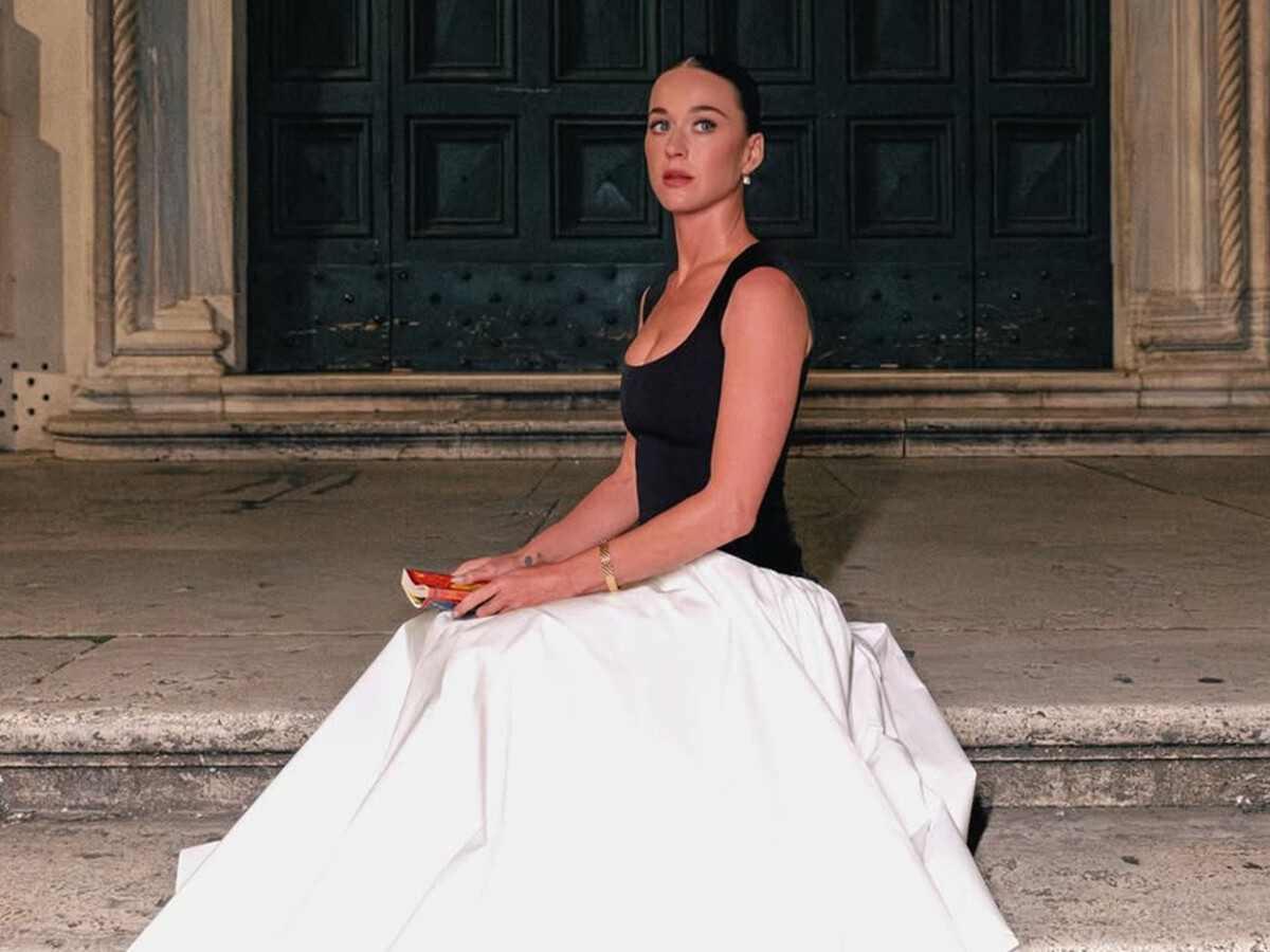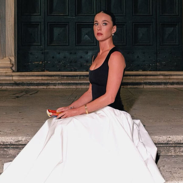 Кэти Перри показала кадры, сделанные во время ее пребывания в Риме. Певица позировала в макси-платье с черным облегающим верхом и белой объемной юбкой. Поп-исполнительница также надела золотые часы и серьги. Артистка собрала волосы в гладкий пучок и сделала макияж. На одном из снимков знаменитость сидела на лестнице.