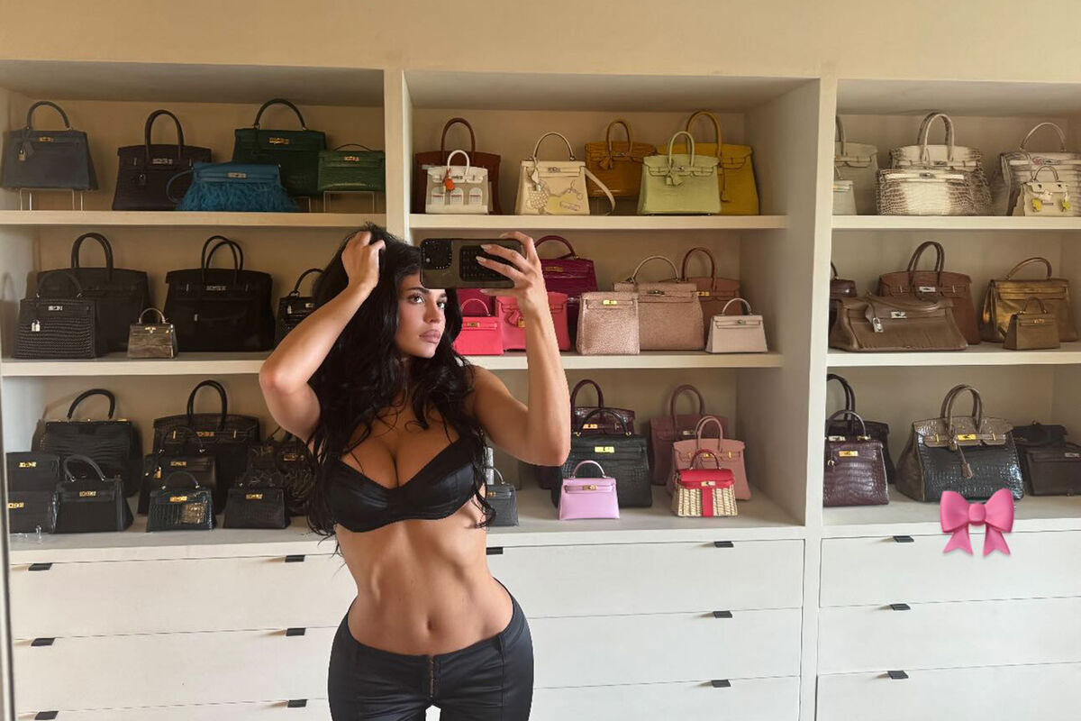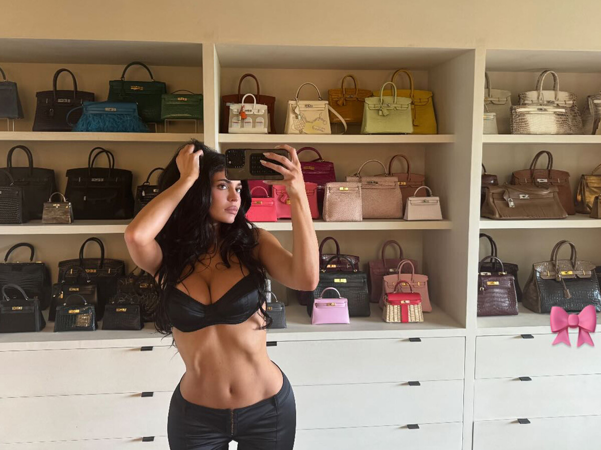 Кайли Дженнер в кожаном лифчике снялась в окружении сумок за миллионы рублей