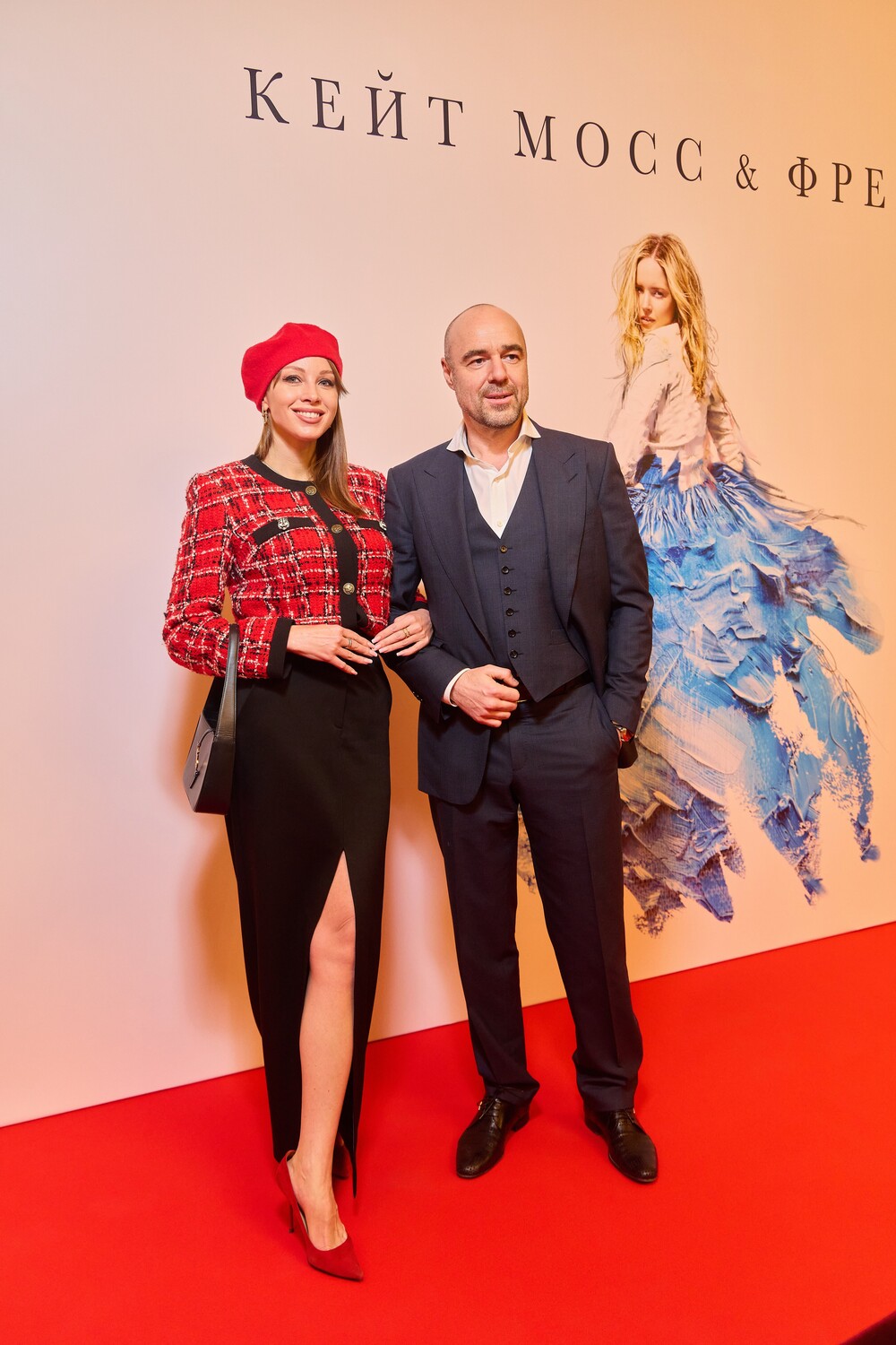 Полина Диброва появилась на публике в красном твидовом жакете с золотыми пуговицами, черной макси-юбке с разрезом и замшевых лодочках. Блогерша дополнила образ беретом, серьгами, несколькими кольцами и черной сумкой Saint Laurent. Она позировала с распущенными волосами и макияжем с черными стрелками и розовой помадой. Бизнесмен предпочел белую рубашку, синий костюм и туфли.