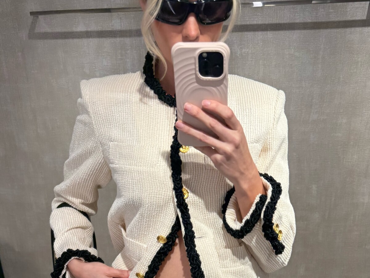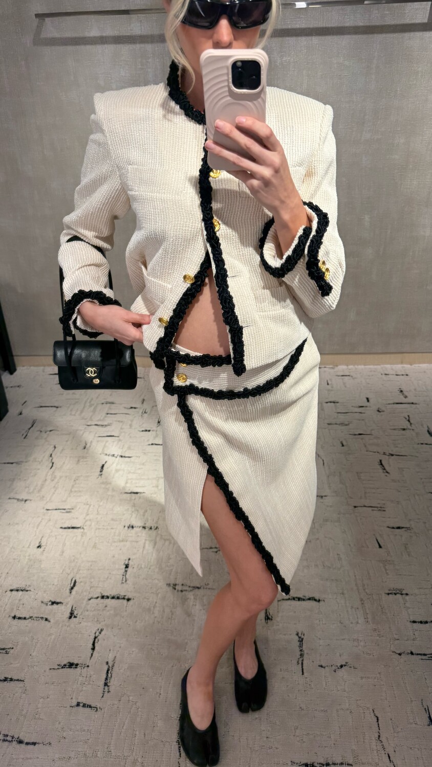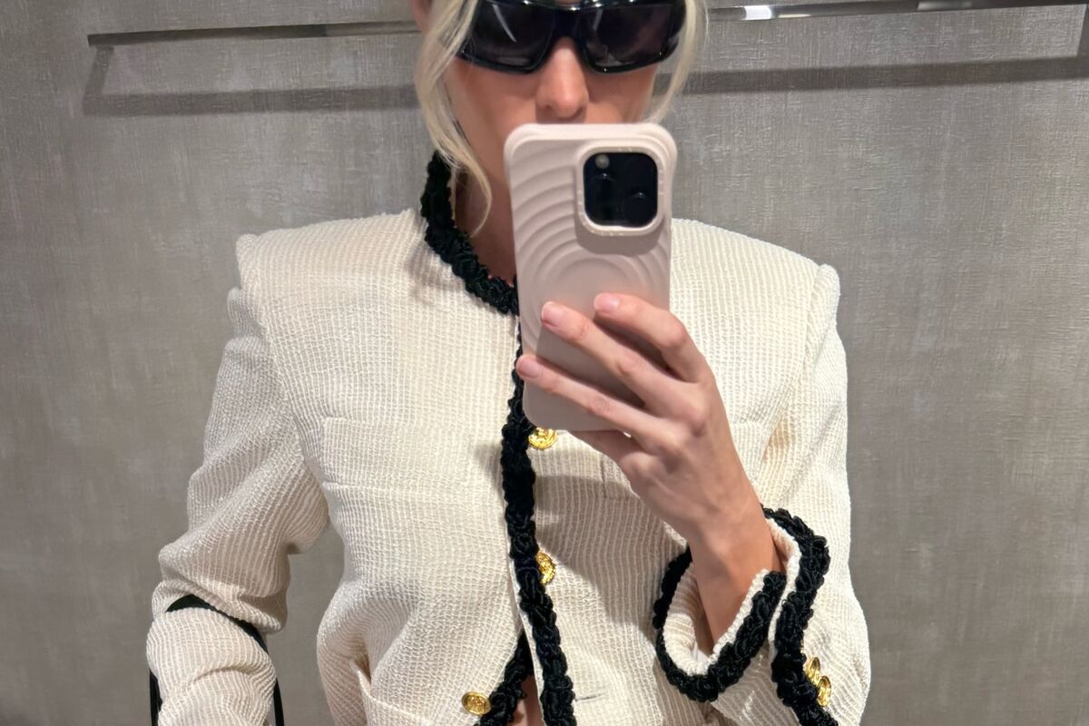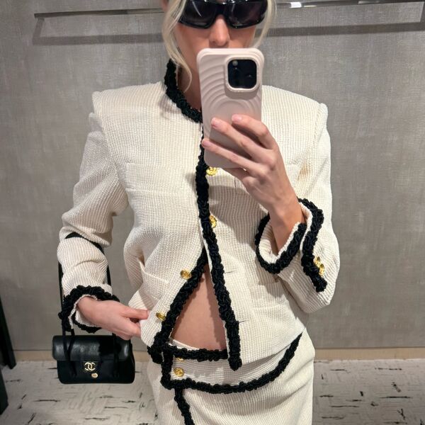 Эльза Хоск позировала в твидовом расстегнутом жакете и юбке с разрезом до бедра от бренда Chanel. Образ дополнила мини-сумка из кожи, туфли и солнцезащитные очки. Волосы ей уложили в низкий пучок и выпустили передние пряди.