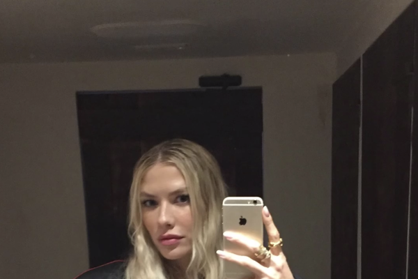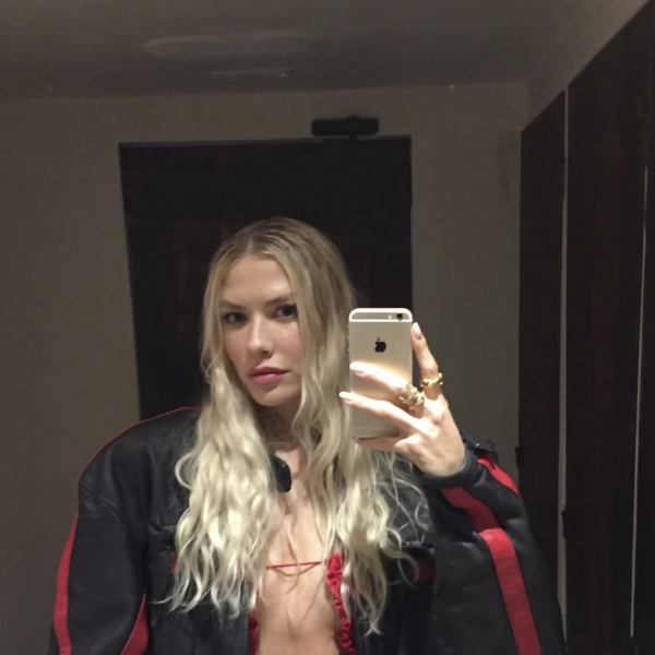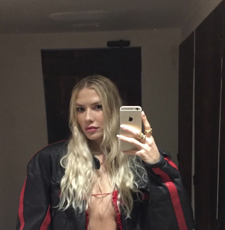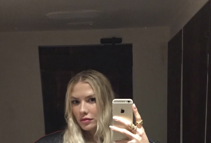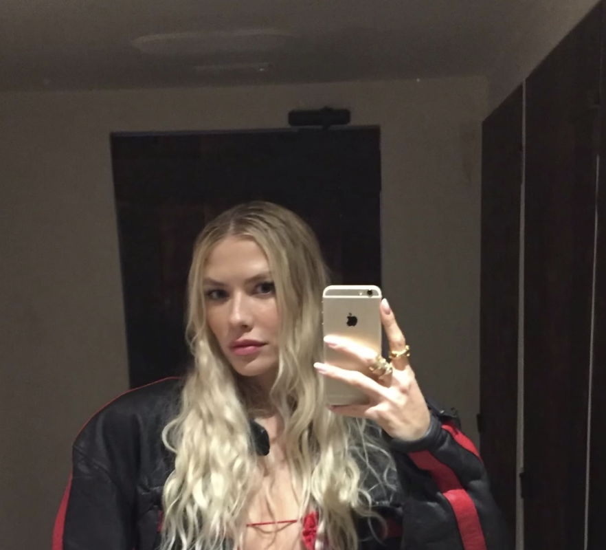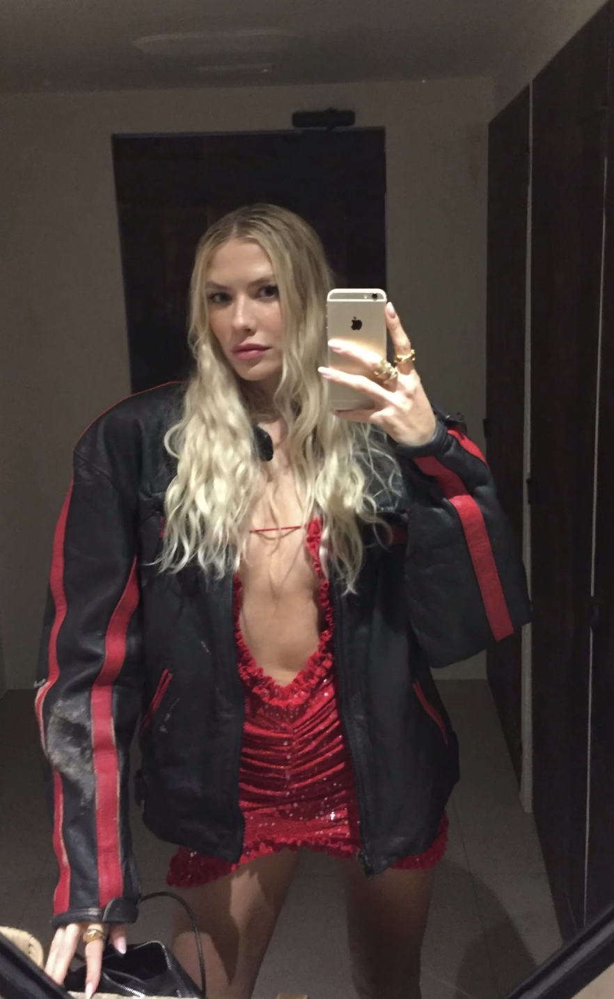 Елена Перминова стояла перед зеркалом в красном мини-платье с вырезом на груди, под которое не стала надевать бюстгальтер. Модель добавила к наряду черную кожаную куртку с полосами и золотые кольца. Манекенщица позировала с распущенными волосами и макияжем в естественном стиле.