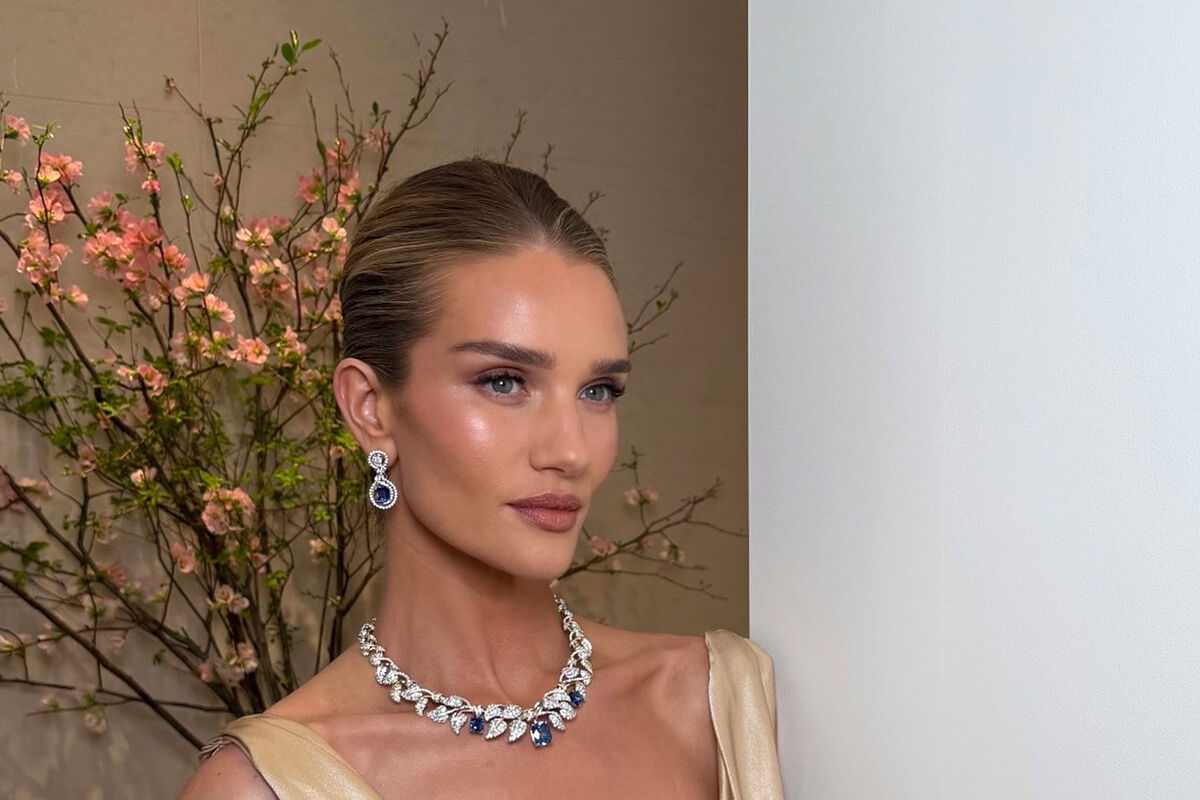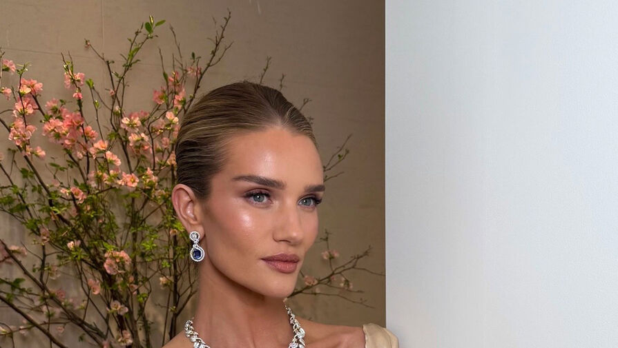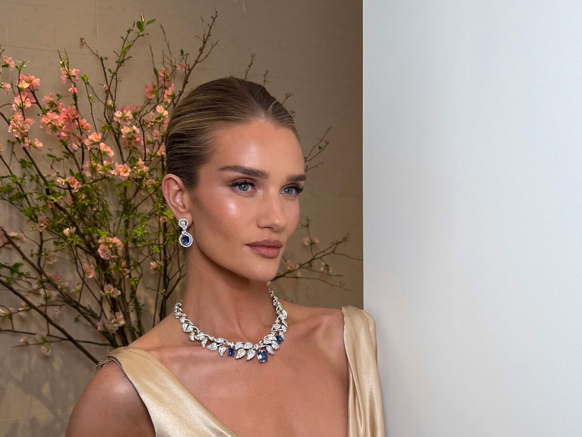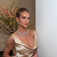 Рози Хантингтон-Уайтли примерила платье с глубоким декольте оттенка шампань, которое дополнила массивными кольцами с бриллиантами, колье и серьгами. Модель позировала с уложенными в гладкий пучок волосами и макияжем с коричневыми тенями, тушью, румянами и розовой помадой.