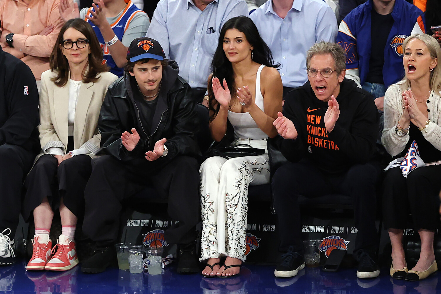 28 апреля Кайли Дженнер и Тимоти Шаламе посетили баскетбольный матч, который прошел на арене Мэдисон-сквер-гарден в Нью-Йорке. Модель пришла на мероприятие в белой облегающей майке, светлых джинсах со стразами в стиле 2000-х, серьгах-кольцах и черных сандалиях. Звезда реалити-шоу уложила волосы в локоны и сделала макияж в естественном стиле. Шаламе предпочел серую футболку, кожаную куртку, черные спортивные брюки, ботинки, кепку и бусы.