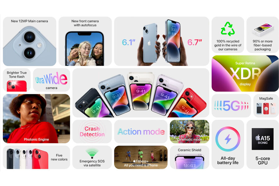 iPhone 14 и 14 Plus получили прошлогодний чип Apple A15 Bionic с одним дополнительным графическим ядром — точно такой же, как в iPhone 13 Pro и Pro Max.