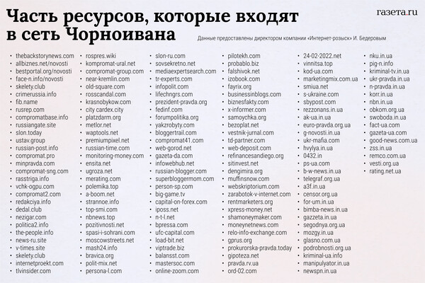 «Этот довольно узкий рынок черного PR в России до СВО был занят практически одной сеткой ресурсов, которая принадлежала Тарасу Чорноивану. Одновременно с ним эту сетку финансировал и продвигал в офисе президента Украины политтехнолог Игорь Мизрах, он умер в 2023 году в украинском СИЗО. Когда Telegram еще не было, вся эта сетка состояла из сайтов-одностраничников, компроматных ресурсов и всяческих отзовиков. Тогда их было около полутора тысячи. Сейчас в их сетке, по разным оценкам, 3,5 тыс. ресурсов», — говорит Бедеров.