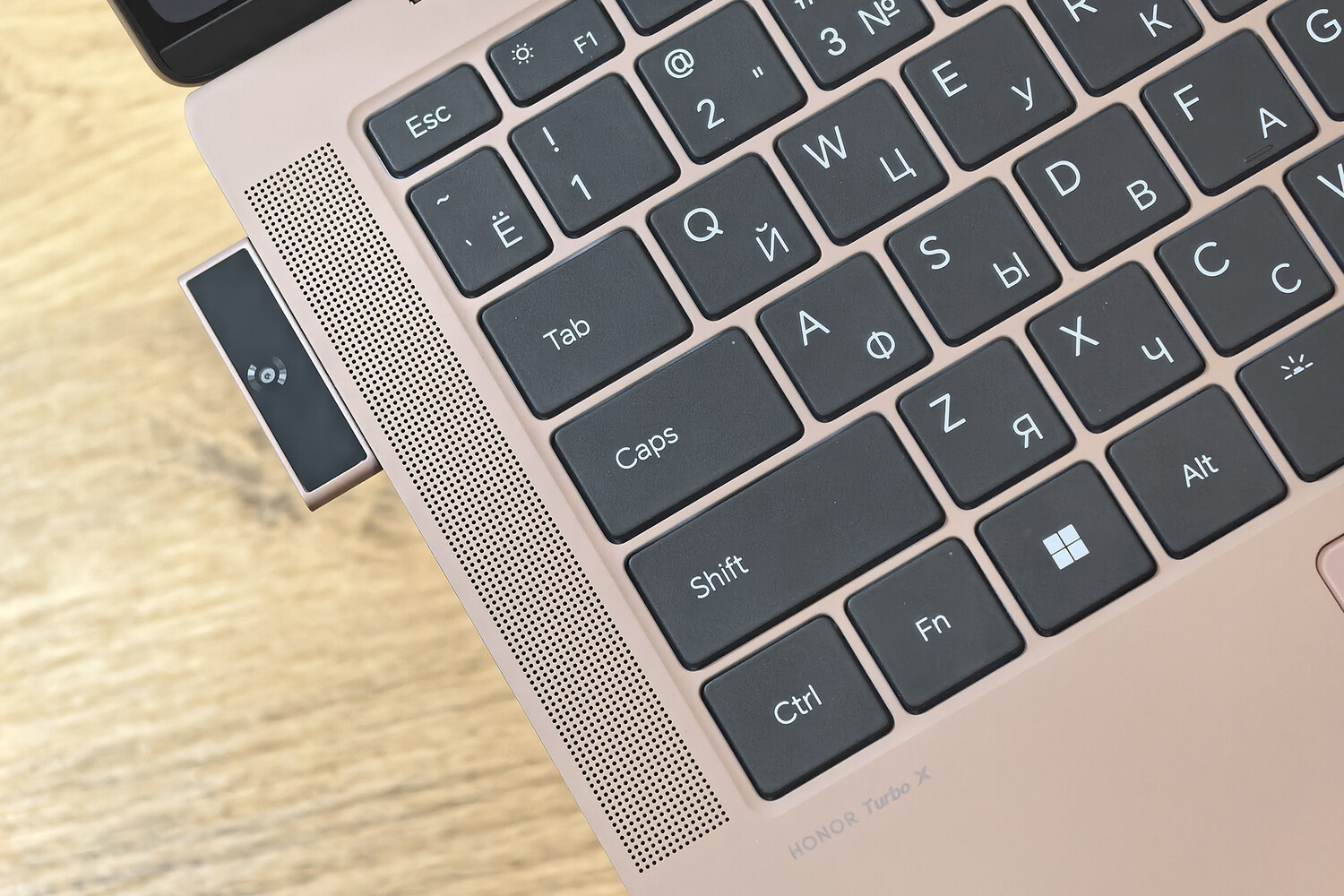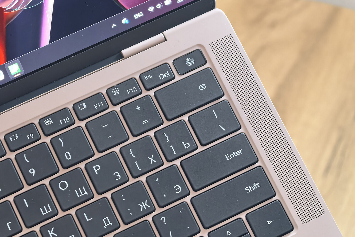Клавиатура тут тоже отличная — ее основание выполнено из титана, а в уголке имеется сканер отпечатков пальцев для авторизации через систему Windows Hello. Ход клавиш приятный, под ними предусмотрена подсветка с регулируемой мощностью.