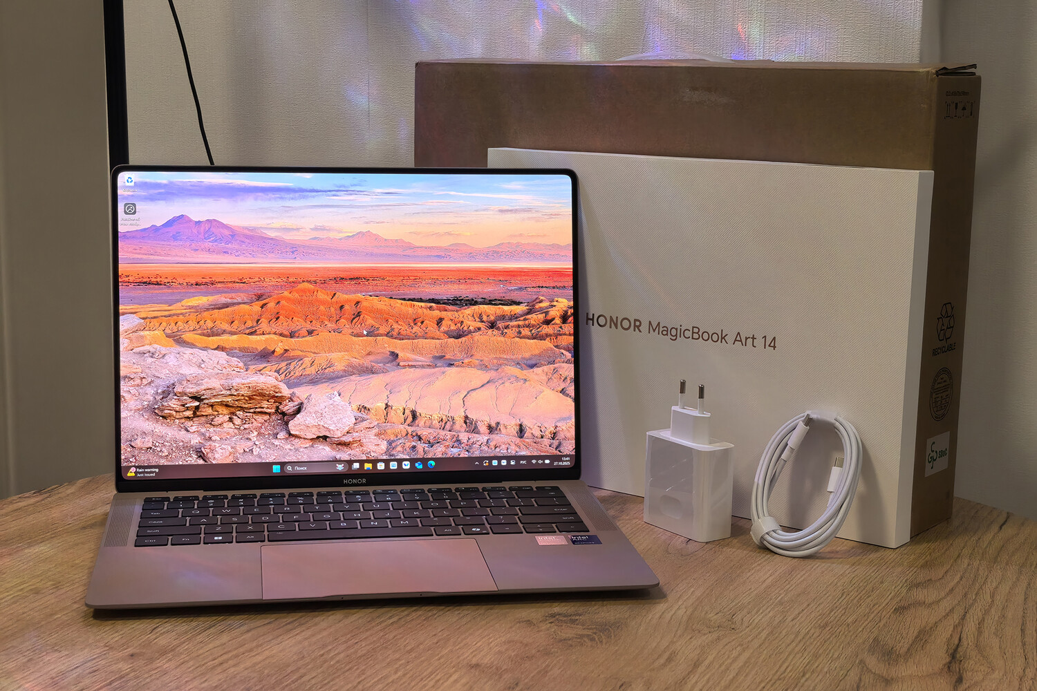 HONOR MagicBook Art 14 поставляется в тончайшей и аккуратной коробке, что крайне непривычно для ноутбуков. В комплект входят ноутбук, блок питания с USB-C, от которого можно заряжать и другие устройства, длинный кабель USB-C на USB-C и документация.