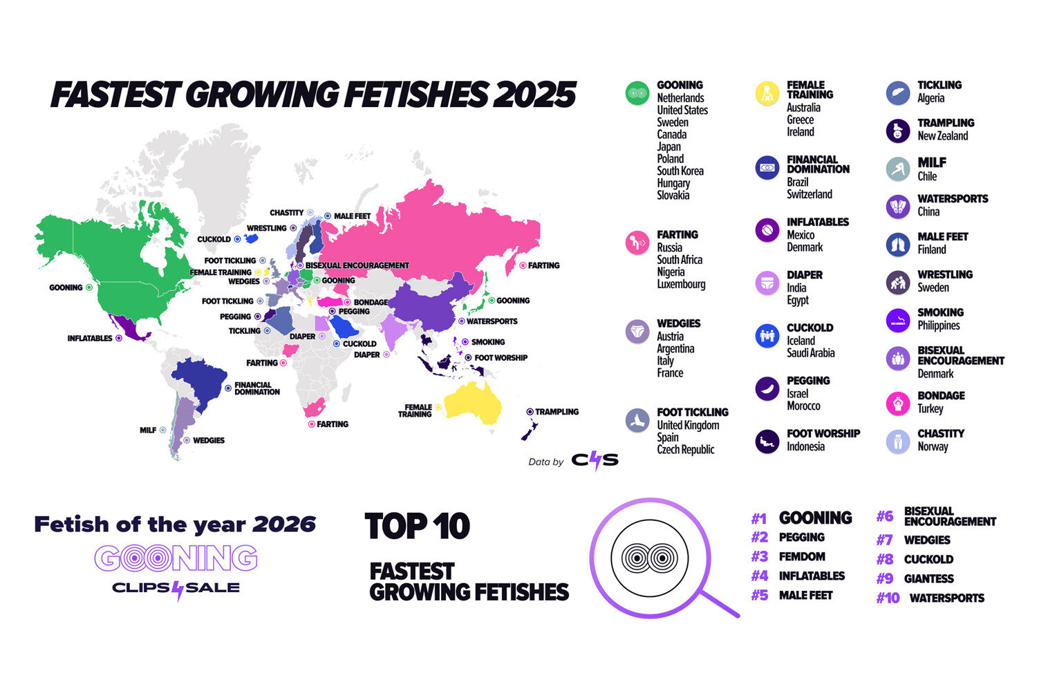 При этом совершенно ясно, когда фартинг стал объектом интереса для условно широких масс: в 2010-е годы, на которые пришелся бум популярности порносайтов и появление ресурса Clips4Sale, который специализируется на публикации контента для фетишистов. Собственно, именно эта платформа и опубликовала инфографику, из которой следует, что в 2025 году в России самым быстро набирающим популярность жанром оказался фартинг. Кроме России такой динамикой в упомянутом жанре отметились ЮАР, Нигерия и Люксембург.