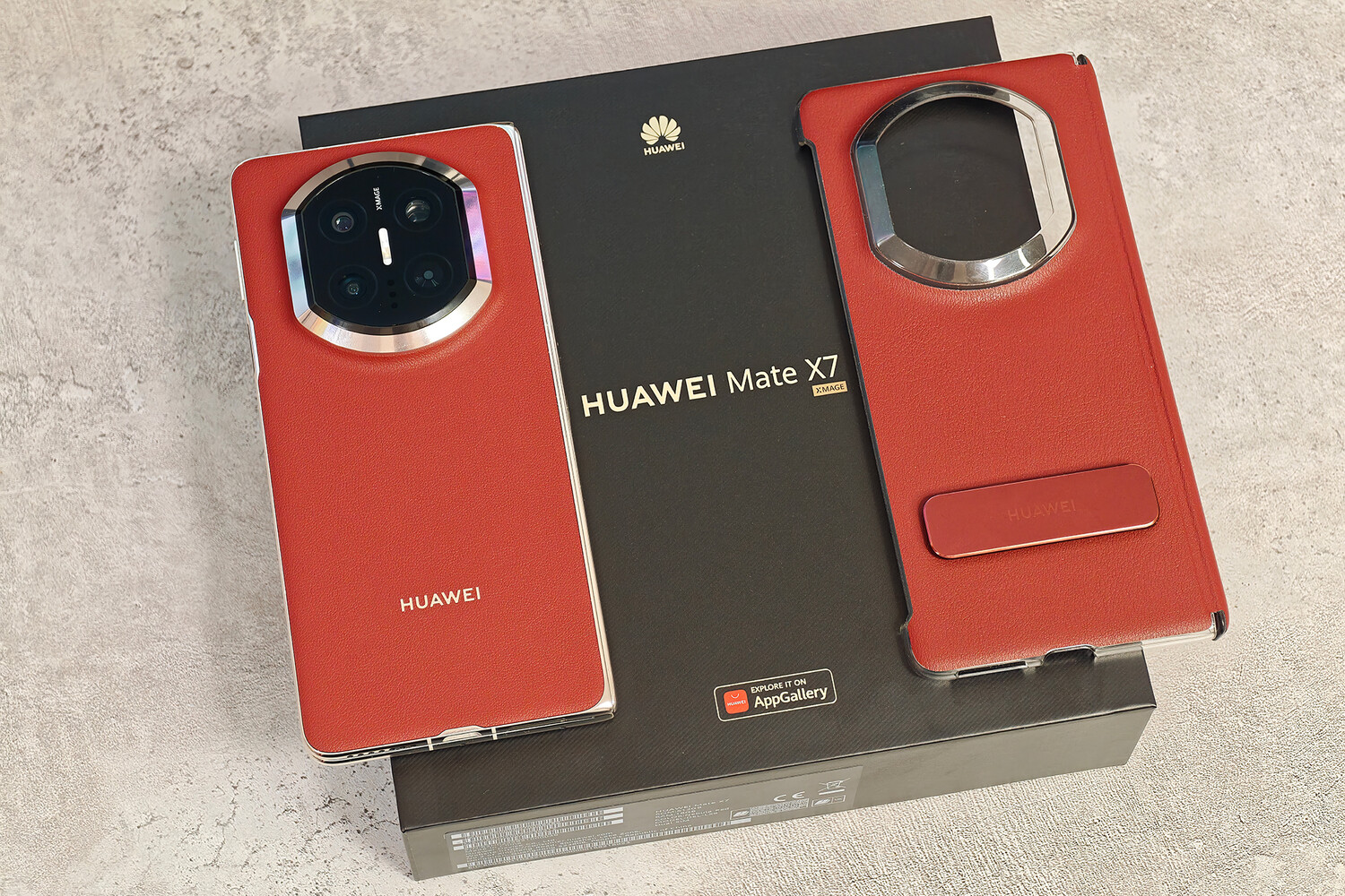 Комплектация у Mate X7 богатая. В квадратной коробке пользователь обнаружит смартфон, чехол из эко-кожи с ножкой-подставкой, зарядный блок, кабель USB-C, инструмент для извлечения SIM-лотка и документацию.