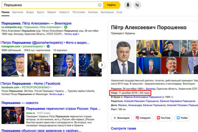В пресс-службе президента Украины Петра Порошенко отреагировали на информацию о том, что при запросе «Петр Порошенко» в «Яндексе» у пользователей отображалась дата смерти президента Украины Петра Порошенко. Об этом сообщает ФАН.