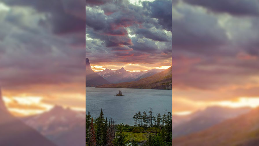 На фотографии изображены лес, озеро и горы на фоне заката.