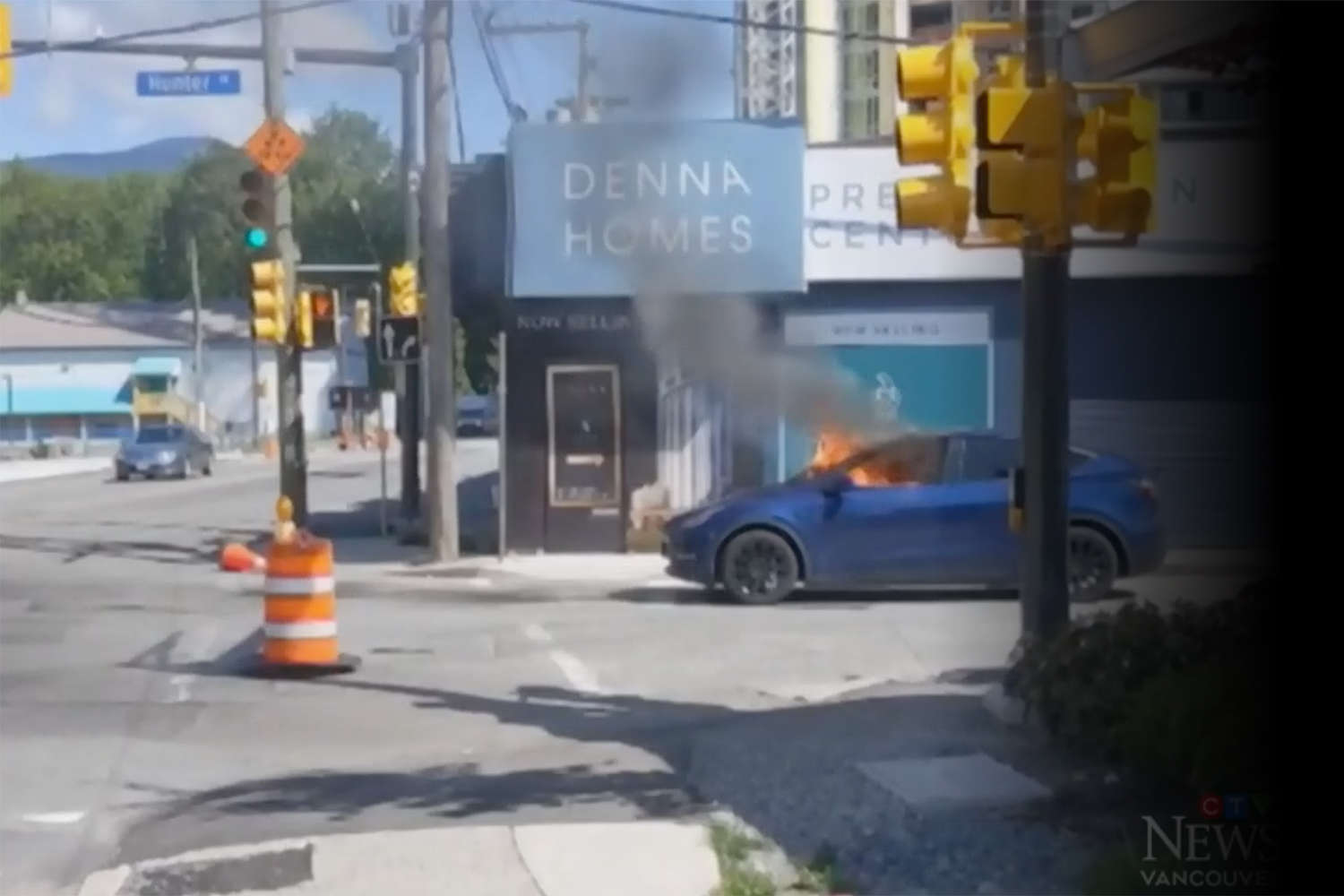 Водитель электрокара Tesla Model Y Джамиль Джута оказался заперт в своем автомобиле на перекрестке во время поездки по Ванкуверу. Канал CTV News опубликовал видео с горящим транспортом.