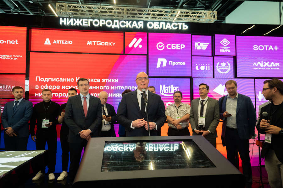 В рамках осмотра экспозиции Дмитрий Чернышенко и Глеб Никитин посетили стенды Гостеха, Росатома, РЖД, Ростелекома, Сбера, РедСофт, Sitronics, КАМАЗа, а также МГТУ Станкин, ITENTIKA и других.