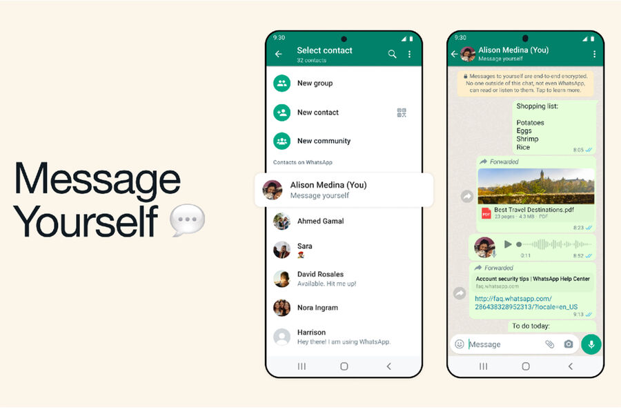 Новая функция позволяет упростить пользователю пересылку самому себе важных сообщений, вроде списков покупок и напоминаний. Теперь чат с самим собой будет находиться над всеми остальными переписками при выборе функции создания нового чата, что облегчит его нахождение и использование. Во многих других мессенджерах уже реализована аналогичная функция — например, в Telegram она называется «Saved Messages».