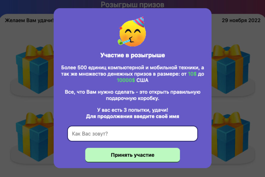 «Пользователю дается три попытки, чтобы выбрать коробку с денежным призом в размере $10 до $10 тыс. После двух неудачных попыток — третья всегда оказывается удачной», – объяснил «Газете. Ru» главный эксперт Центра реагирования на инциденты информационной безопасности Group-IB Глеб Мартьянов.