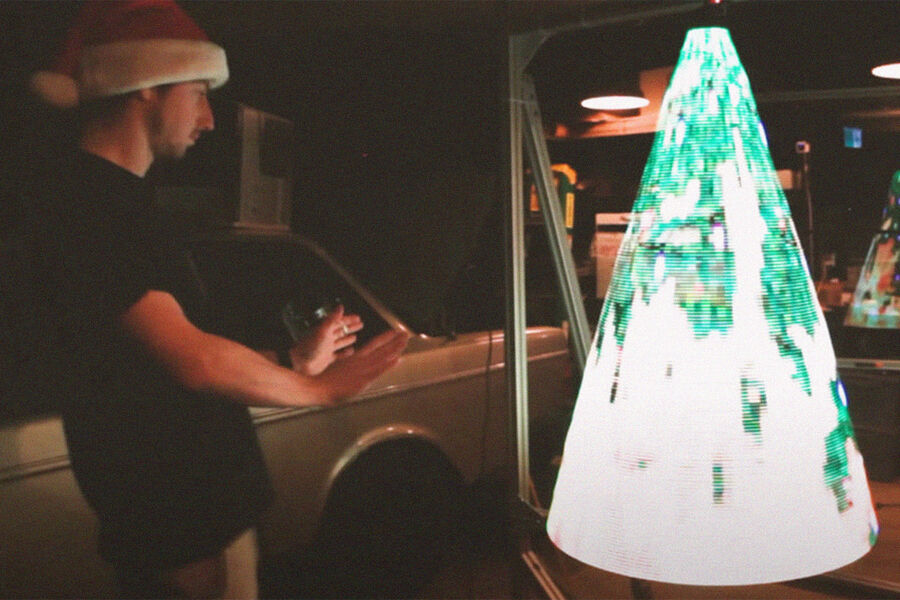 Внешне высокотехнологичная ель похожа на каркас в виде конуса, прикрепленный к металлическим балкам. Однако благодаря RGB-светодиодам и небольшому моторчику, разработка Ходжинса умеет быстро вращаться, создавая эффект полностью наряженного новогоднего атрибута.