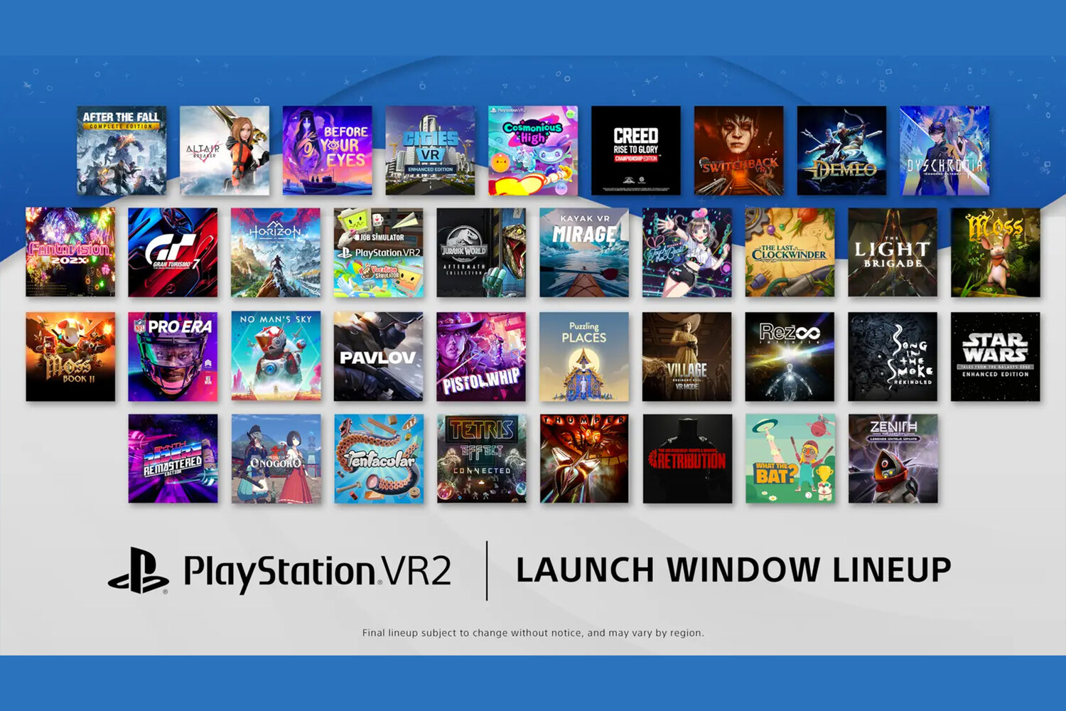 Полный список тайтлов для PlayStation VR2, которые были официально подтверждены, выглядит следующим образом: After the Fall, ALTAIR BREAKER, Before Your Eyes, Cities VR, Cosmonious High, Creed: Rise To Glory в издании Championship Edition, The Dark Pictures: Switchback VR, Demeo, DYSCHRONIA: Chronos Alternate, Fantavision 202X, Gran Turismo 7, Horizon Call of the Mountain, Job Simulator, Jurassic World Aftermath Collection, Kayak VR: Mirage, Kizuna AI: Touch the Beat!, The Last Clockwinder, The Light Brigade, Moss, Moss: Book II, NFL Pro Era, No Man's Sky, Pavlov VR, Pistol Whip, Puzzling Places, Resident Evil Village, Rez Infinite, Song in the Smoke: Rekindled, Star Wars: Tales from the Galaxy's Edge — Enhanced Edition, Synth Riders, The Tale of Onogoro, Tentacular, Tetris Effect: Connected, Thumper, The Walking Dead: Saints & Sinners — Chapter 2: Retribution, Vacation Simulator, What the Bat и Zenith: The Last City.