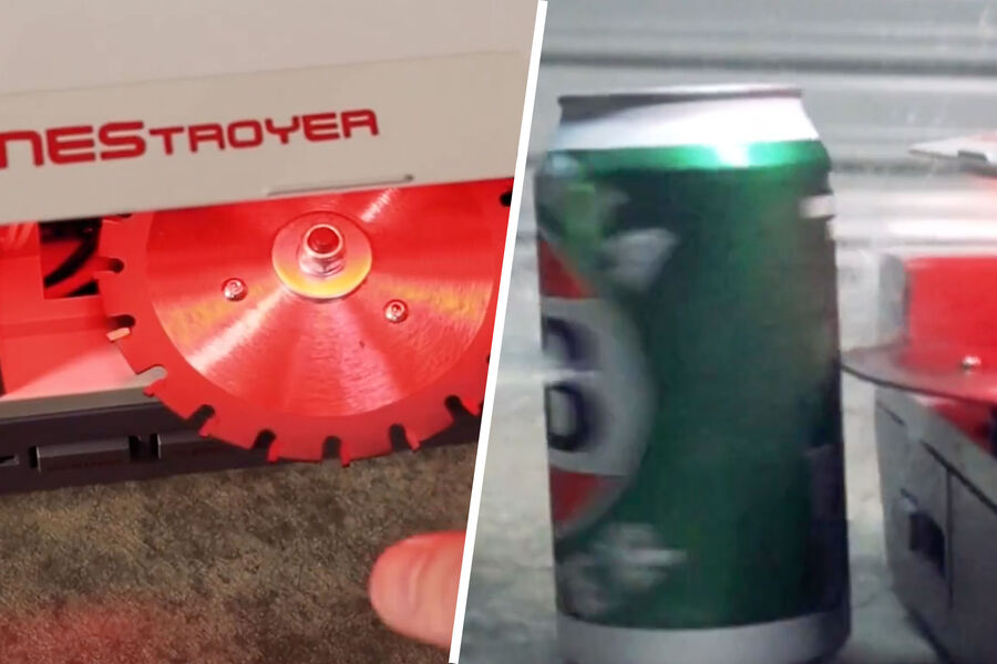 Новое изобретение Electrosync назвал NESdestroyer. Мобильный робот оснащен циркулярной пилой, которая может легко разрезать в том числе арбузы и пивные банки.