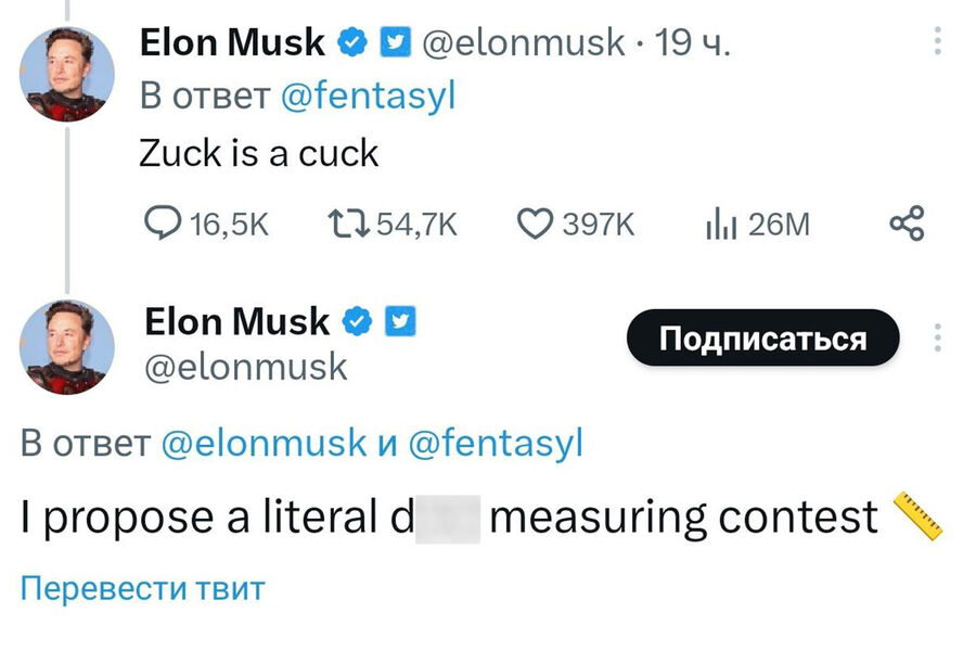 «Я предлагаю соревнование — у кого длиннее член», — заявил Маск. Цукерберг пока никак не отреагировал на это заявление.