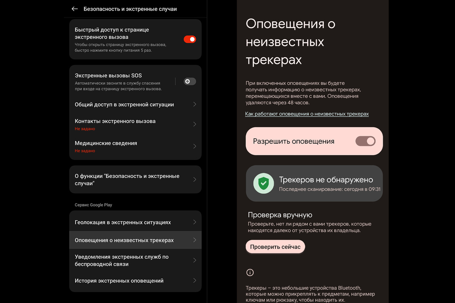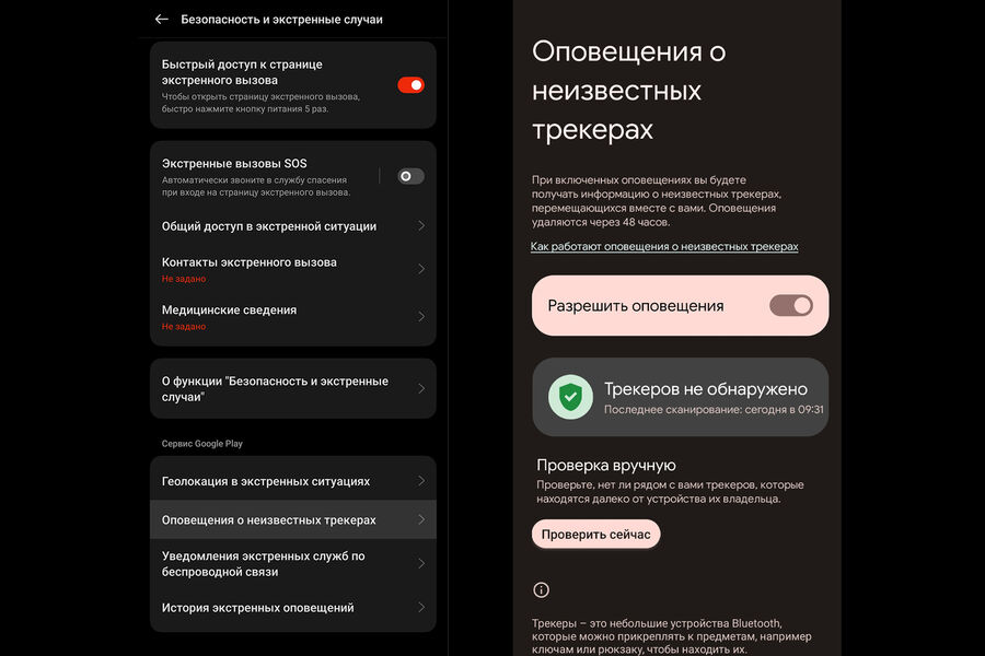 Проверить, появилась ли у вас функция «Оповещения о неизвестных трекерах», можно в «Настройках» в разделе «Безопасность и экстренные случаи». Она включена по умолчанию и, если смартфон заметит перемещающийся за пользователем трекер, автоматически предупредит о возможной слежке. При нажатии на уведомление пользователь сможет увидеть карту с местами, где трекер следовал за ним, а также включить звуковой сигнал на трекере для его обнаружения. Также пользователь сможет полностью отключить трекер от передачи данных о своем местоположении.