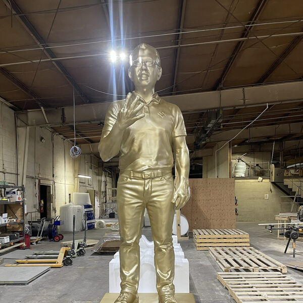 Монумент, изображающий Чжао с его характерным жестом — поднятыми четырьмя пальцами, символизирующими отказ от страха и сомнений, будет выставлен на всеобщее обозрение на несколько часов. В дальнейшем статую планируется передать самому Чжао в качестве подарка или продать с аукциона в пользу его некоммерческого образовательного проекта Giggle Academy.