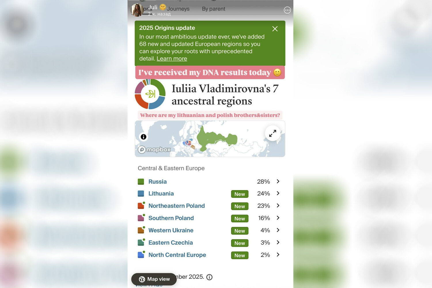 Хотя сама девушка обратила внимание только на народы с наивысшей степенью родства, на скриншоте можно увидеть и другие страны, где предположительно жили ее предки. В частности, можно увидеть, что Вавилова на 4% украинка, а также – на 3% чешка.