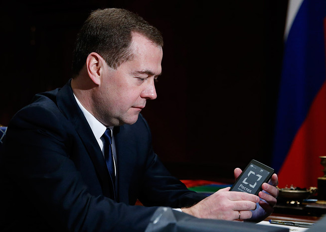 Премьер-министр России Дмитрий Медведев получил в подарок первый российский смартфон производства «Ростеха» YotaPhone с двумя дисплеями. Устройство оснащено двухъядерным процессором Krait, 4,3-дюймовым LCD-дисплеем, 4,3-дюймовым EPD-дисплеем, 13-мегапиксельной основной камерой, 1-мегапиксельной фронтальной камерой, 2 Гб оперативной памяти и 32 Гб встроенной памяти.